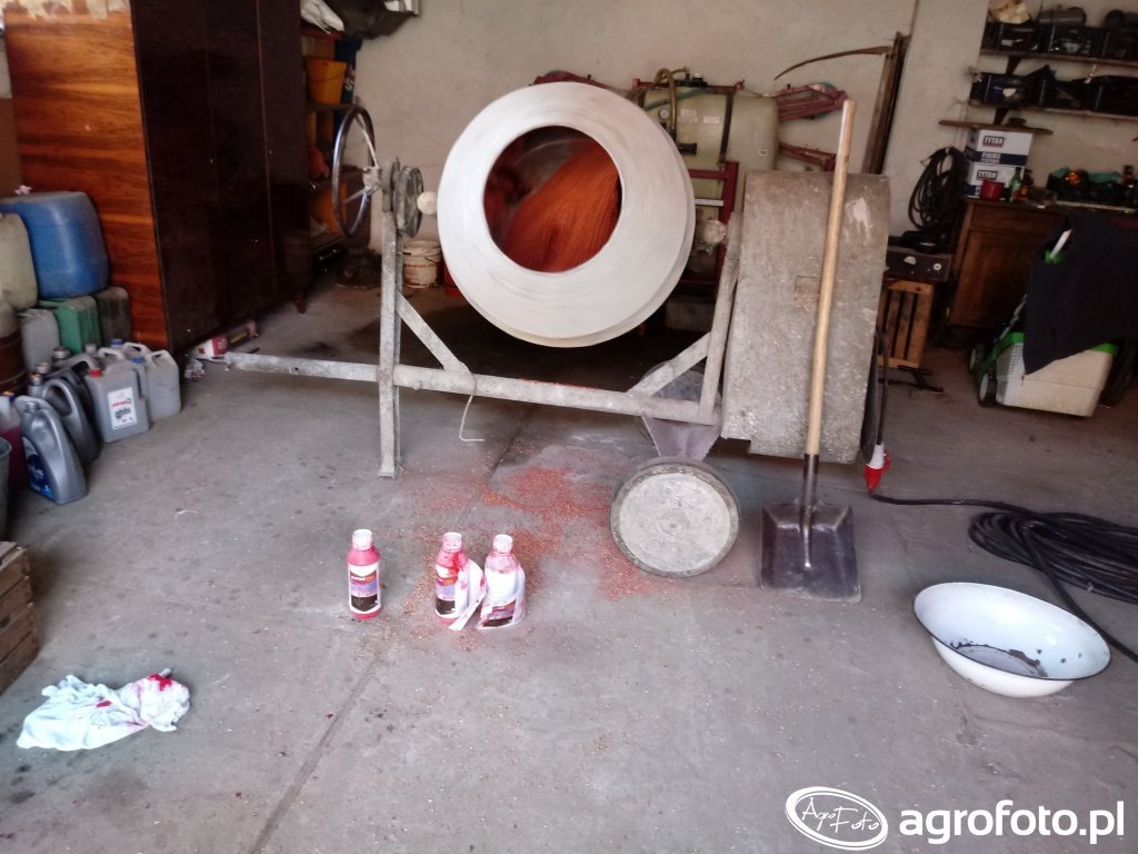 Zaprawianie zboża w betoniarce. W moich stronach jest to najpopularniejszy sposób zaprawiania zboża. Wydajność ponad 1 t na h