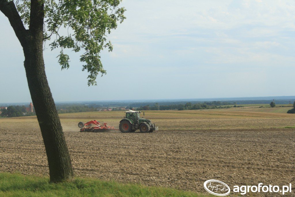 Ciągnik Fendt, prawdopodobnie model z serii 700 Vario, podczas intensywnej pracy na polu, współpracuje z agregatem uprawowo-siewnym. Wyposażony w wydajny silnik Deutz o mocy około 165 KM, ten ciągnik charakteryzuje się płynną przekładnią bezstopniową Vario, co pozwala na precyzyjne dostosowanie prędkości do warunków pracy. Sześcio cylindrowy silnik o pojemności 6.06 L zapewnia efektywność i niezawodność, niezbędne w ciężkich pracach uprawowych. Jego solidna konstrukcja i zaawansowane technologie wspierają rolnika w efektywnym zarządzaniu polami, umożliwiając płynne operacje nawet z ciężkimi narzędziami towarzyszącymi, co zwiększa wydajność pracy i optymalizuje zużycie paliwa.