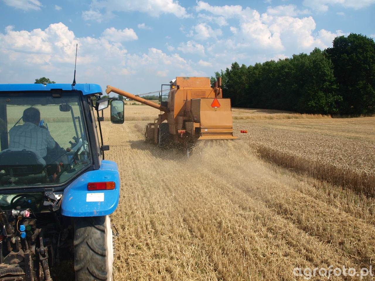 Kombajn Bizon Super Z056 podczas prac żniwnych na polu zboża. Maszyna ta, znana z charakterystycznej pomarańczowej konstrukcji, jest wyposażona w heder z motowidłami, co umożliwia efektywne koszenie zbóż. Kombajn napędzany jest silnikiem o mocy 100 KM, a system omłotu wykorzystuje bęben młócący, co zapewnia wysoką wydajność przy minimalnych stratach ziarna. Zbiornik o pojemności 2540 litrów pozwala na dłuższą pracę bez konieczności częstego opróżniania. Zdjęcie przedstawia kombajn działający w szerokim polu, otoczonym drzewami, co podkreśla jego rolę w intensywnych żniwach w naturalnym wiejskim krajobrazie.
