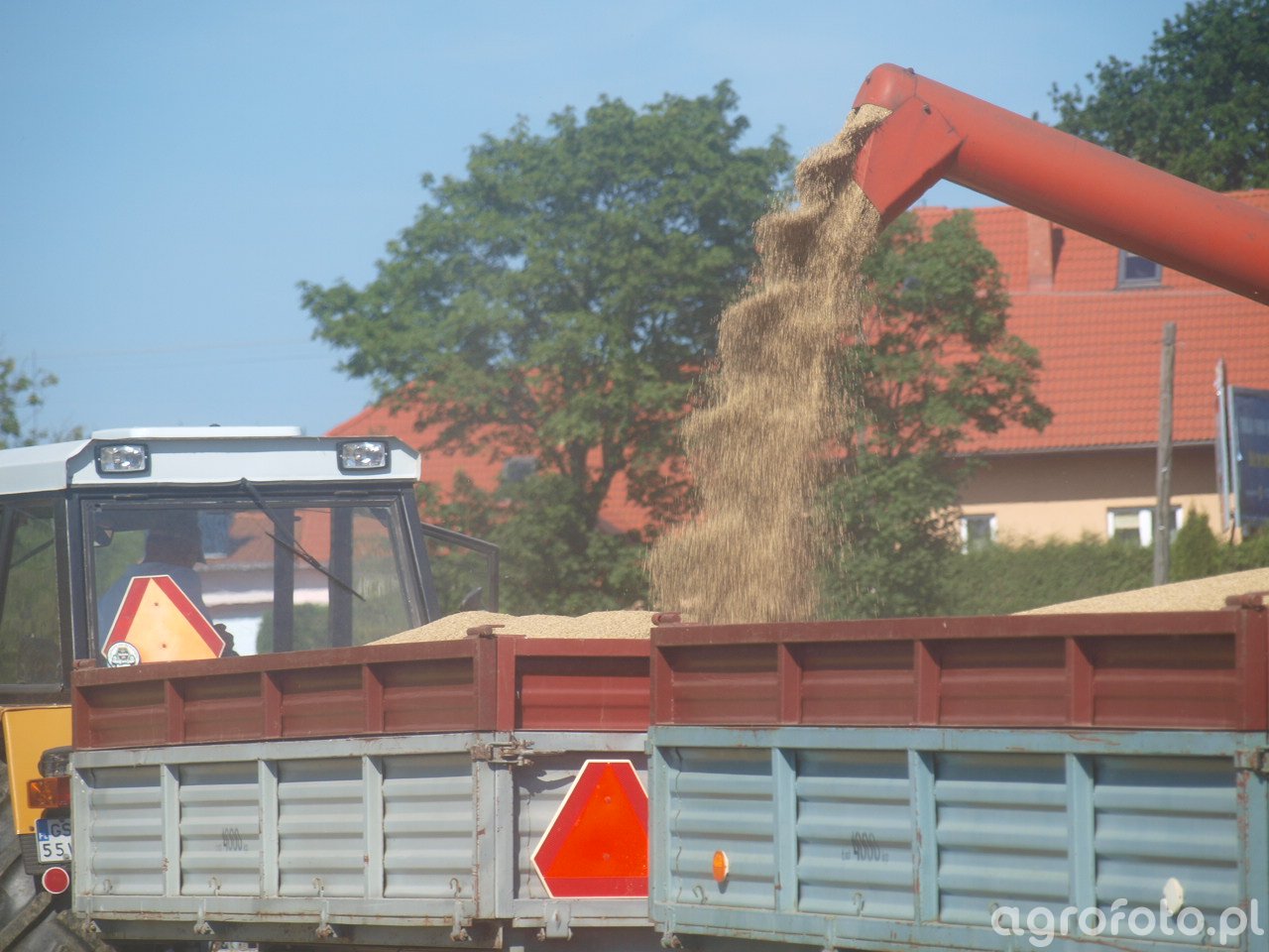 Kombajn Bizon Super Z056 podczas rozładunku zboża na polu. Maszyna jest wyposażona w czterorzędowy heder z motowidłami, co czyni ją odpowiednią do koszenia zbóż na dużych obszarach. Sercem kombajnu jest sześciocylindrowy silnik o mocy około 100 KM, co pozwala na wydajną pracę w polu podczas intensywnych żniw. Zbiornik ziarna o pojemności 2900 litrów umożliwia dłuższe zbieranie bez częstych przestojów na rozładunek. Na zdjęciu proces rozładunku następuje poprzez typowy czerwony wysięgnik, co jest charakterystyczne dla tego modelu, przekazując zgromadzone ziarno do przyczepy ciągnika Ursus widocznego w tle. Otoczenie polne wskazuje na południową część kraju, gdzie Bizon Super Z056 skutecznie wspiera żniwa w okresie letnim.