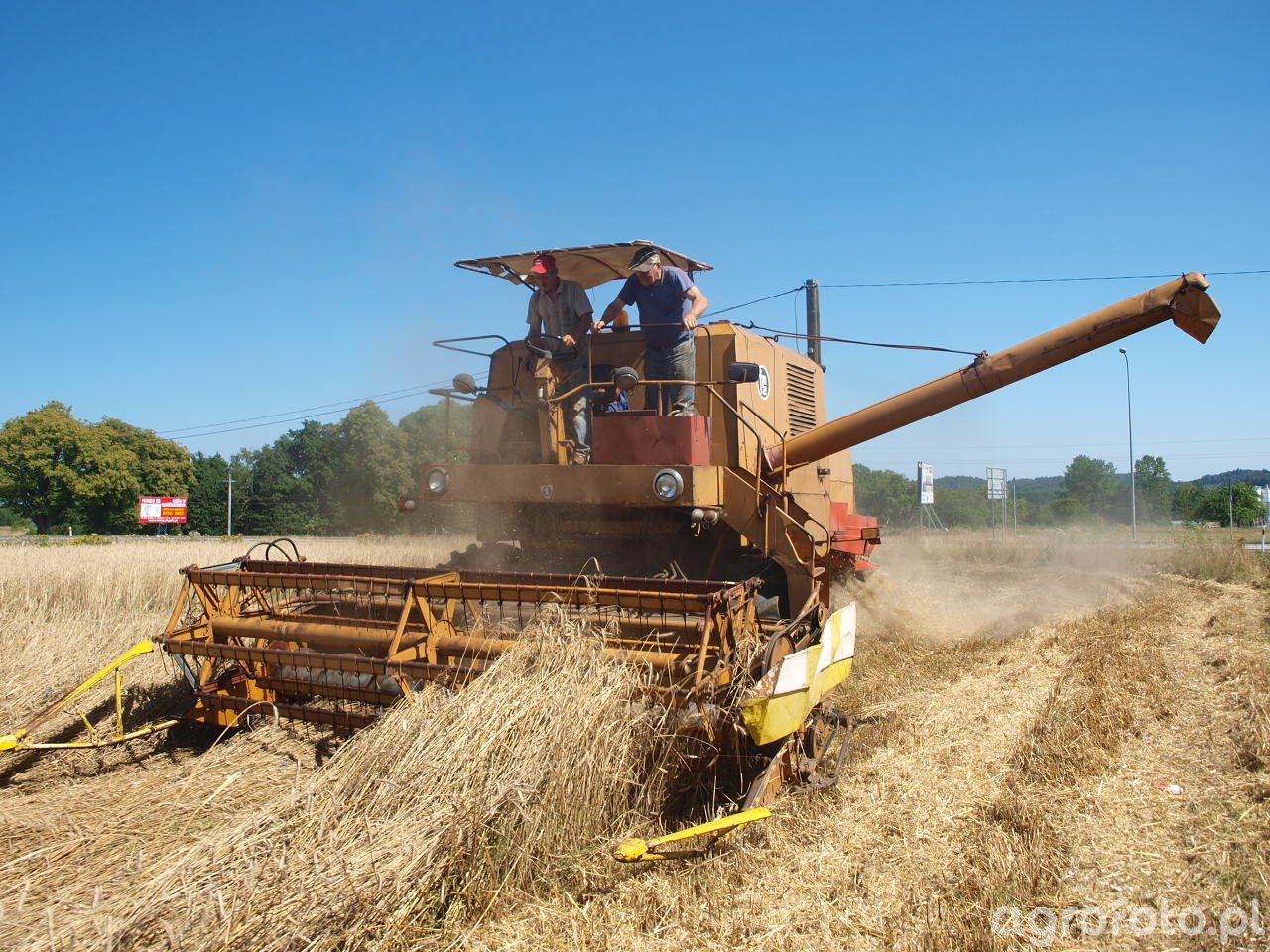 Kombajn Bizon Super Z056 podczas koszenia zbóż na polu. Ten model, charakterystyczny dla polskiego przemysłu maszyn rolniczych z rocznika 1981, jest wyposażony w silnik wysokoprężny o mocy około 100 KM. Maszyna wykorzystuje bębnowy system omłotu oraz posiada zbiornik ziarna o pojemności 2100 litrów, co pozwala na efektywne przeprowadzanie żniw. Heder z motowidłami zapewnia precyzyjne cięcie, co jest kluczowe w procesie zbioru zbóż. Na zdjęciu widoczny jest kombajn w trakcie intensywnej pracy na jasnym, rozległym polu zbożowym, co podkreśla jego solidną konstrukcję i zdolność do wydajnego działania w różnorodnych warunkach terenowych.