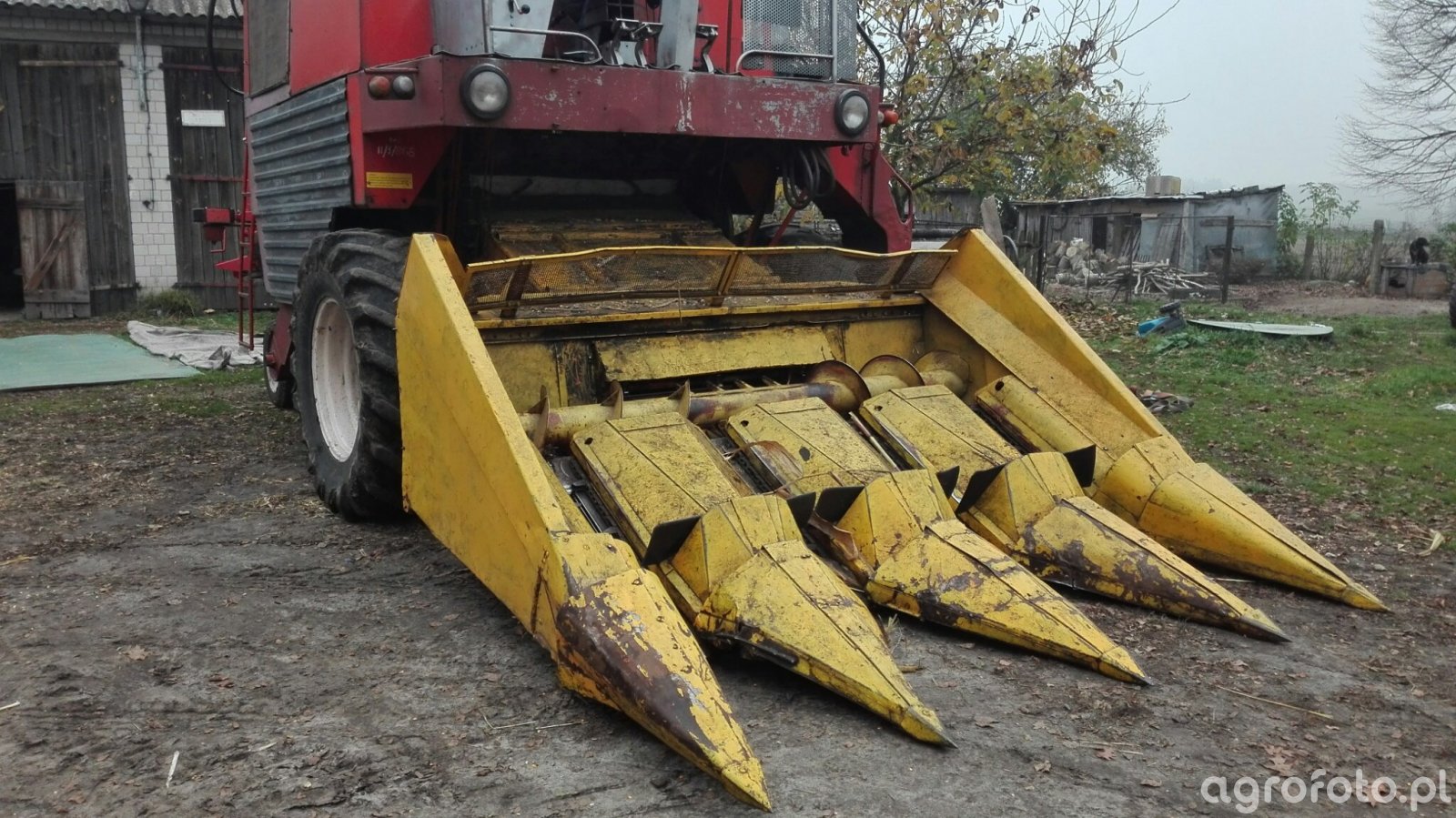 Kombajn Bizon podczas zbioru kukurydzy. Maszyna wyposażona jest w charakterystyczny żółty heder z dziobami, typowy dla pracy z kukurydzą, co umożliwia skuteczną separację kolb od łodyg. Bizon, polska marka znana ze swojej solidności, zazwyczaj oferuje modele z silnikami o mocy w przedziale około 150–240 KM. System omłotu tej maszyny korzysta z bębnów młócących, co zapewnia efektywne oddzielanie ziarna. Kombajn ten przedstawiony jest w typowym otoczeniu gospodarstwa rolnego, przygotowany do rozpoczęcia sezonu żniwnego. Zastosowanie odpowiedniego hedera zwiększa wydajność pracy, minimalizując straty podczas zbiorów. Dzięki solidnej konstrukcji Bizon zapewnia niezawodne działanie nawet w wymagających warunkach polowych.