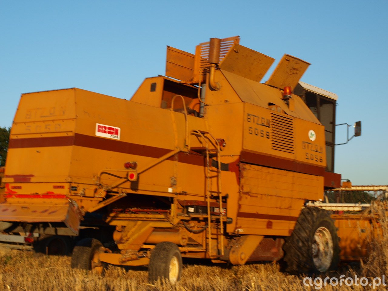 Kombajn Bizon Rekord Z058 podczas prac żniwnych na polu zboża. Maszyna została wyposażona w heder z motowidłami, co wspiera efektywne koszenie zbóż. Bizon Z058, produkowany w Polsce, dysponuje silnikiem o mocy 150 KM, co zapewnia odpowiednią wydajność podczas długich dni żniwnych. Zbiornik ziarna o pojemności 3 000 litrów pozwala na dłuższe okresy pracy bez potrzeby częstego opróżniania. Charakterystyczna pomarańczowa konstrukcja z wyraźnym logiem Ursus nadaje maszynie rozpoznawalny wygląd, dobrze wkomponowując się w krajobraz pól podczas żniw. Kombajn sprawnie operuje na ściernisku, zapewniając efektywne i niezawodne wykonanie prac rolniczych.