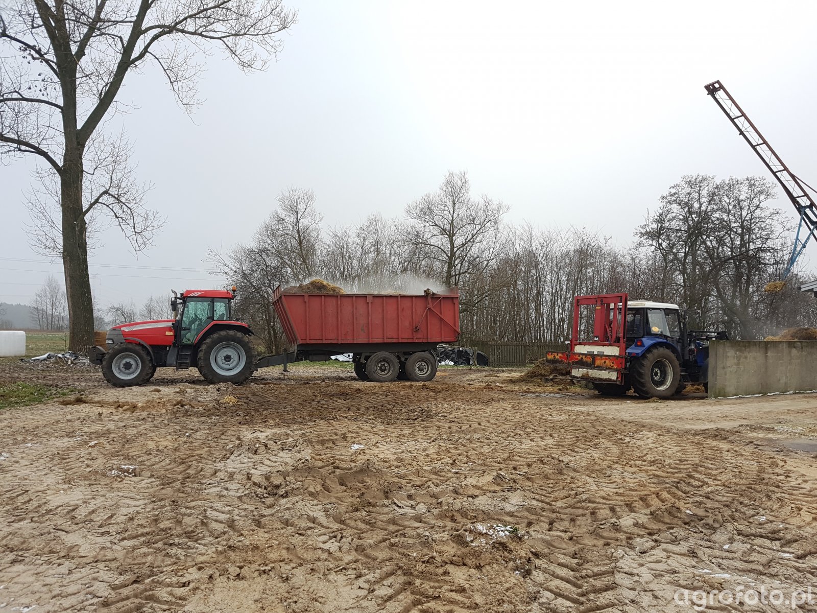 McCormick MTX135 – solidny koń pociągowy, który na polskiej wsi zyskał miano niezawodnego. Widoczny tu egzemplarz to prawdziwy wół roboczy. Pod maską drzemie 6-cylindrowy Perkins o mocy 135 KM, który w latach produkcji (ok. 2002-2007) był synonimem siły i ekonomii. Dziś, mimo upływu lat, zadbany MTX135 to wciąż gratka, trzymająca cenę w przedziale 90-150 tys. zł, zwłaszcza gdy, jak tutaj, wciąż dzielnie stawia czoła codziennym obowiązkom. Ciągnie potężną przyczepę pełną obornika – widać, że to ciężka robota, a maszyna bez zająknięcia wypluwa z siebie parę, niczym smok przed rozładunkiem. Obok, w akcji przy betonowym korycie, Farmtrac 685 DT – sprytny, 4-cylindrowy pomocnik o mocy 85 KM, idealny do lżejszych prac na placu czy do obsługi ładowacza obornika. Oba sprzęty, choć z różnych półek i epok, świetnie się uzupełniają, udowadniając, że liczy się nie tylko moc, ale i niezawodność w każdych warunkach, zwłaszcza w ten, typowo jesienno-zimowy, deszczowo-błotny dzień.