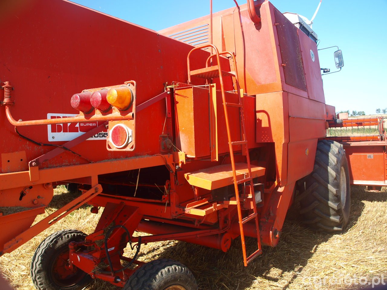 Kombajn Bizon Super Z056 podczas prac żniwnych na polu. Maszyna wyróżnia się charakterystycznym pomarańczowym kolorem i prostokątną kabiną operatora. Bizon Super Z056 jest wyposażony w rzędowy heder z motowidłami, który doskonale sprawdza się przy koszeniu zbóż. Urządzenie napędzane jest silnikiem wysokoprężnym o mocy około 100 KM, co zapewnia wystarczającą moc do efektywnego działania w polu. Zbiornik na ziarno o pojemności 3000 litrów pozwala na długotrwałą pracę bez częstych przerw na rozładunek. Kombajn posiada tradycyjny system omłotu, który umożliwia precyzyjne oddzielanie ziarna od słomy. Warunki pracy na ściernisku i obecność słońca sprzyjają szybkiej i wydajnej realizacji żniw. Model Super Z056 jest klasykiem wśród maszyn żniwnych, cenionym za solidność konstrukcji i niezawodność w różnych warunkach polowych.