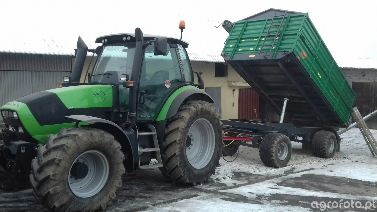 Ciągnik Deutz-Fahr Agrolux dynamicznie przemierza plac gospodarstwa, obsługując przyczepę rolniczą. Sercem tej maszyny jest silnik o mocy 75 KM, który zapewnia wydajność niezbędną do codziennych prac na farmie. Czterocylindrowa jednostka napędowa skutecznie radzi sobie z zadaniami transportowymi i polowymi, a mechaniczna skrzynia biegów 12/4 daje operacyjność w różnych warunkach terenowych. Taki zestaw cech mechanicznych umożliwia efektywne przewożenie materiałów rolniczych, co jest kluczowe dla logistyki gospodarstwa.
