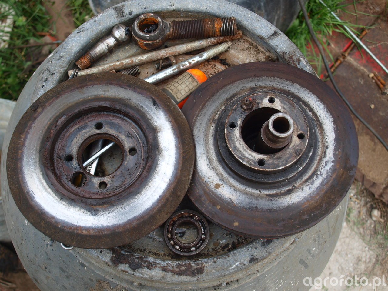 Nie mogę zidentyfikować kombajnu na podstawie tego obrazu, ponieważ zawiera on jedynie części mechaniczne, takie jak łożyska i elementy wariatora, prawdopodobnie związane z maszyną rolniczą. Skupiając się na kontekście technicznym, można stwierdzić, że zestawienia elementów ukazują naprawę lub konserwację podzespołów kombajnu zbożowego. Części te mogą być związane z transmisją lub napędem, które są kluczowe dla działania maszyny. Takie podejście do serwisowania jest istotnym elementem utrzymania kombajnu w dobrej kondycji i zapewnienia jego sprawnej pracy podczas intensywnych okresów żniwnych.