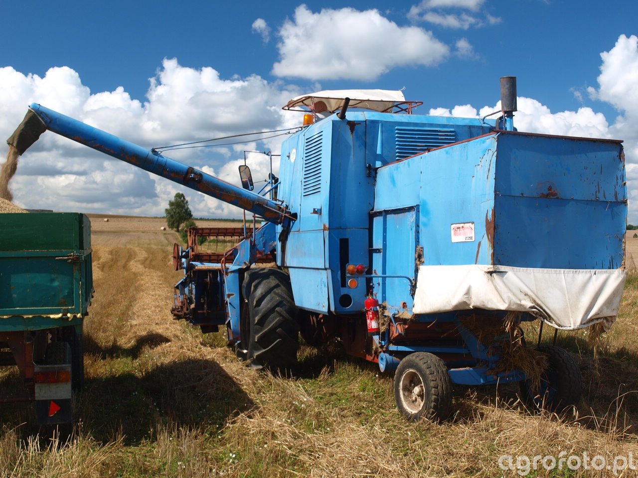 Kombajn Bizon Super Z056 podczas prac żniwnych na polu zboża. Widoczny na zdjęciu klasyczny model charakteryzuje się niebieską kolorystyką i tradycyjną konstrukcją kabiny oraz hederem wyposażonym w motowidła, wskazującym na koszenie zbóż. Maszyna jest wyposażona w sześciocylindrowy silnik SW 400 o mocy 100 KM, co pozwala na efektywne wykonywanie żniw. Zbiornik na ziarno o pojemności 3 200 litrów oraz mechaniczny system omłotu pracują w synchronizacji, zapewniając sprawne zbieranie ziarna, które następnie transportowane jest do zielonej przyczepy. Kombajn widoczny jest w trakcie wysypywania ziarna, z charakterystycznym, bocznym układem wysypu, co jest typowe dla tej serii. Praca odbywa się na ściernisku, a pogodny dzień sprzyja efektywności zbiorów.