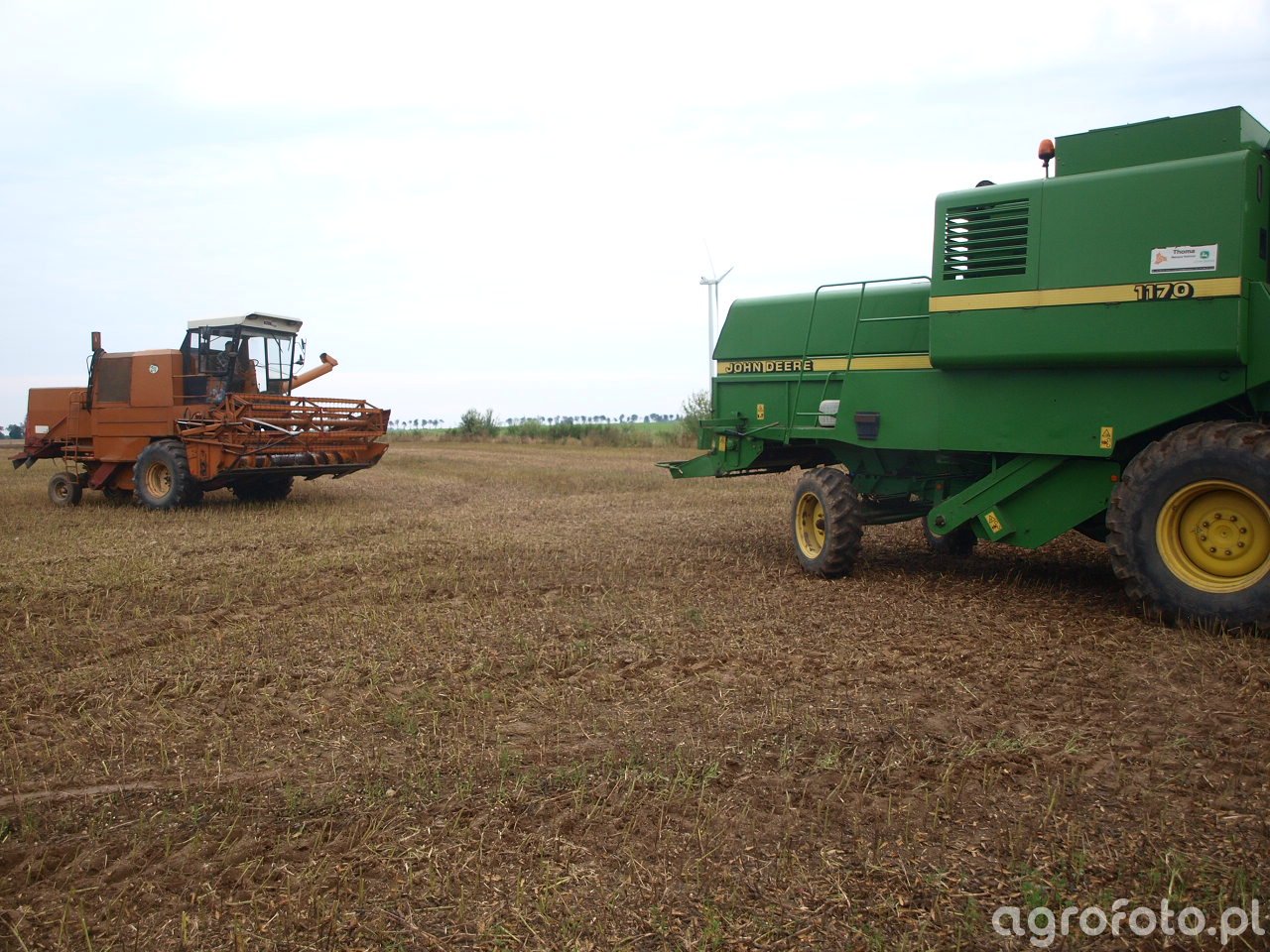 Kombajn Bizon Super Z056 podczas prac żniwnych na polu ścierniska. Wyposażony w heder z motowidłami, idealnie nadaje się do koszenia zbóż. Bizon Super Z056 napędzany jest sześciocylindrowym silnikiem wysokoprężnym o mocy 105 KM, który umożliwia efektywne zasilanie tradycyjnego systemu omłotu bębnowego. Zbiornik na ziarno mieści 2 540 litrów, co pozwala na dłuższą pracę bez konieczności częstego wyładunku. W oddali widoczny jest również kombajn John Deere 1170, który wyróżnia się swoją charakterystyczną zieloną kolorystyką. Obie maszyny pracują w harmonii, przyczyniając się do wydajnych żniw na rozległym polu.