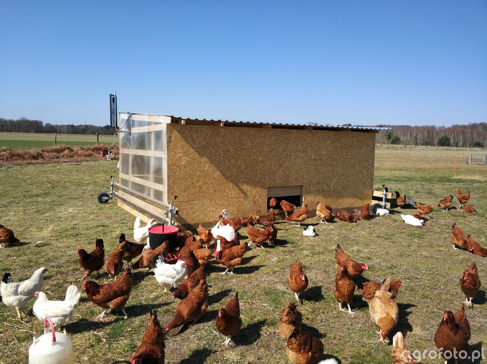 Nasze kury na pastwisku wraz z naszym mobilnym kurnikem - zwanym z angielskiego egg mobile. Wiecej na moim kanale na youtube Lubuskie Angusowo