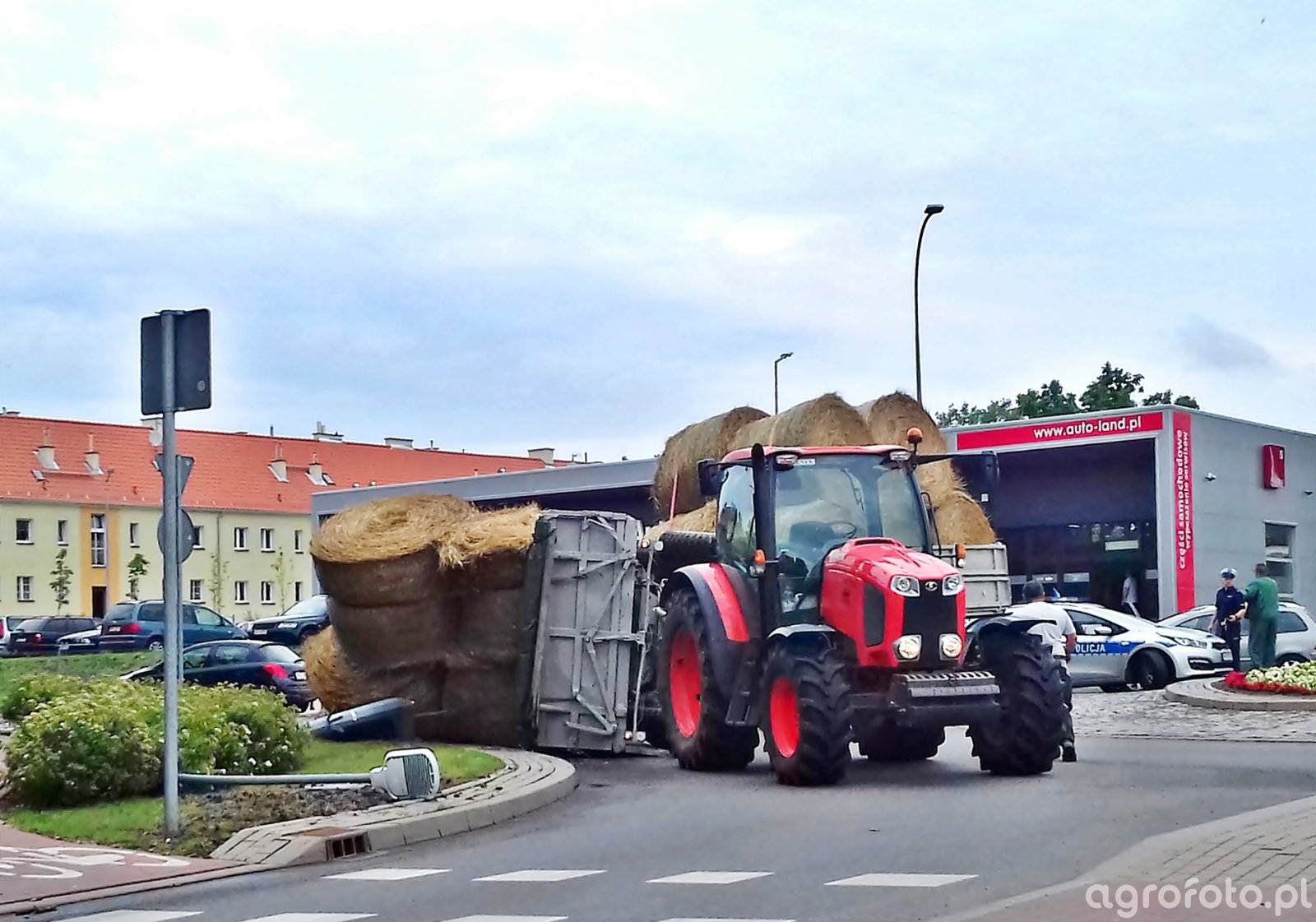 Ciągnik Kubota M135GX manewruje na placu gospodarstwa z przyczepą rolniczą, gotową do transportu bel. Wyposażony w silnik Kubota o mocy 135 KM i pojemności 6,1 litra, M135GX zapewnia stałą, niezawodną pracę nawet w wymagających warunkach. Mechaniczna skrzynia biegów 12/12 umożliwia płynną zmianę przełożeń podczas manewrowania, co jest kluczowe w operacjach załadunkowych. Maksymalny udźwig tylnego TUZ wynoszący 6100 kg czyni ten model doskonałym wyborem do współpracy z różnorodnym osprzętem, zwiększając wydajność i elastyczność zastosowania. Kubota M135GX, dzięki tak bogatym parametrom technicznym, bez problemu radzi sobie z ciężkimi przyczepami obciążonymi belami słomy, co czyni go niezbędnym narzędziem w gospodarstwie rolnym.