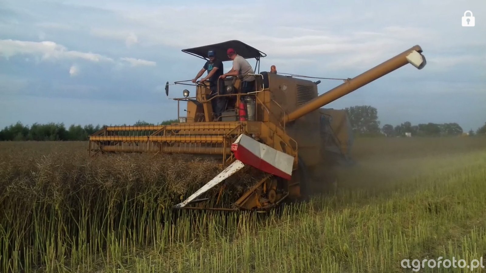 Kombajn Bizon Super Z056 podczas koszenia zboża na polu. Wyposażony w klasyczny heder z motowidłami, dedykowany pracom żniwnym, ten model wykorzystuje silnik o mocy 120 KM, umożliwiający wydajną pracę na dużych areałach. System omłotu oparty na tradycyjnym bębnie młócącym zapewnia skuteczność przy różnych rodzajach zbóż. Pojemność zbiornika ziarna wynosi 3 000 litrów, co pozwala na znaczne interwały między rozładunkami. Widoczny na polu w trakcie pracy, Bizon Super Z056 ilustruje typowe zastosowanie w żniwnych zadaniach, skutecznie łącząc wydajność z niezawodną konstrukcją.