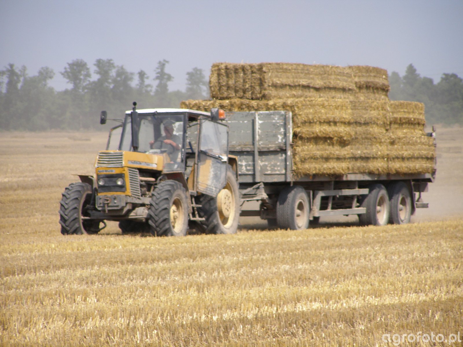 Ursus 1224 podczas transportu bel słomy po ściernisku wykorzystuje pełnię możliwości sześciocylindrowego silnika Andoria Z8001 o pojemności 7,0 l i mocy około 117 KM, współpracując z rolniczą przyczepą dostosowaną do przewozu ładunków objętościowych. Mechaniczna skrzynia biegów z reduktorem oferuje 16 przełożeń do przodu i 8 wstecz, co ułatwia dobór prędkości zarówno w pracy polowej przy prasowaniu słomy, jak i w transporcie z pola do gospodarstwa. Masa własna ciągnika przekraczająca 5,0 t zapewnia dobrą trakcję i stabilność zestawu na nierównym ściernisku, a tylny TUZ o udźwigu około 4,2 t pozwala na agregowanie cięższych maszyn uprawowych czy pras zwijających. Model Ursus 1224 był produkowany w latach około 1984–1993, a przybliżone ceny rynkowe używanych egzemplarzy w Polsce mieszczą się zwykle w przedziale 40–70 tys. zł w zależności od stanu technicznego i wyposażenia.