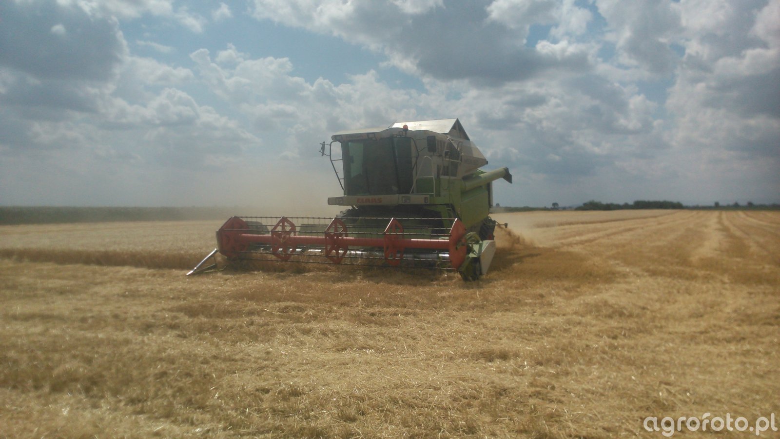 Kombajn Claas Mega 360 podczas koszenia zbóż na polu. Maszyna wykorzystuje system omłotu APS (Accelerated Pre-Separation System), który przyspiesza przepływ materiału i poprawia efektywność pracy. Napędzana silnikiem Mercedes-Benz o mocy 250 KM, maszyna jest przystosowana do intensywnej pracy na dużych areałach. Wyposażony w heder z motowidłami, umożliwia precyzyjne koszenie szerokich pasów zbóż. Zbiornik o pojemności 8 600 litrów gwarantuje długotrwałe operacje bez częstych przerw na rozładunek. Kombajn pracuje na przestronnym polu pod pochmurnym, letnim niebem, co podkreśla jego wszechstronność w zróżnicowanych warunkach pogodowych.