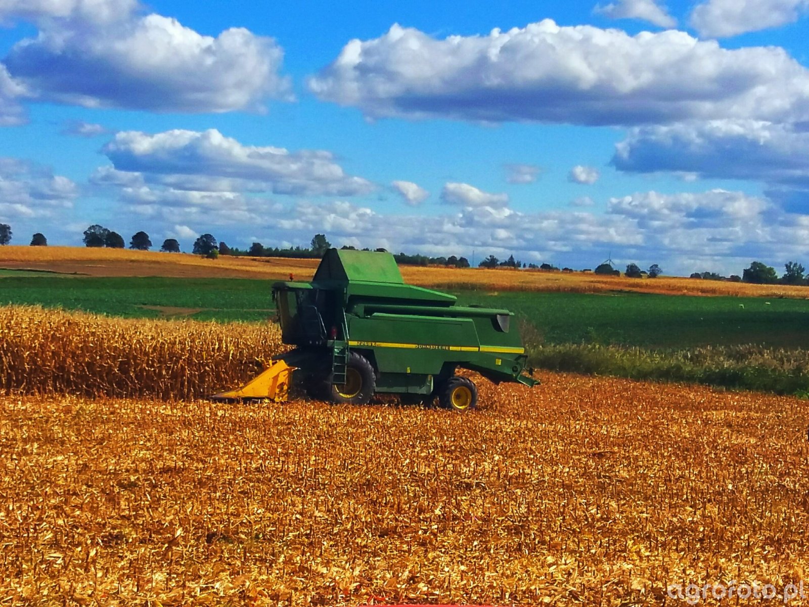 Kombajn John Deere 2266 Extra podczas zbioru kukurydzy na polu. Widoczny na zdjęciu zielony kombajn jest wyposażony w heder z dzióbami, co wskazuje na przystosowanie do skutecznego zbioru kolb kukurydzy. Model 2266 Extra jest napędzany silnikiem o mocy około 290 KM, co zapewnia wydajną pracę w różnorodnych warunkach polowych. Maszyna posiada system omłotu z bębnem ośmiołopatkowym, co pozwala na efektywne oddzielanie ziarna od kolb. Kombajn pracuje w optymalnych warunkach na rozległym polu, na jasnym tle błękitnego nieba z lekkimi chmurami, co podkreśla typowy krajobraz rolniczy. Zbiornik o dużej pojemności umożliwia długotrwałą pracę bez konieczności częstego rozładunku, co zwiększa efektywność podczas intensywnych prac żniwnych.
