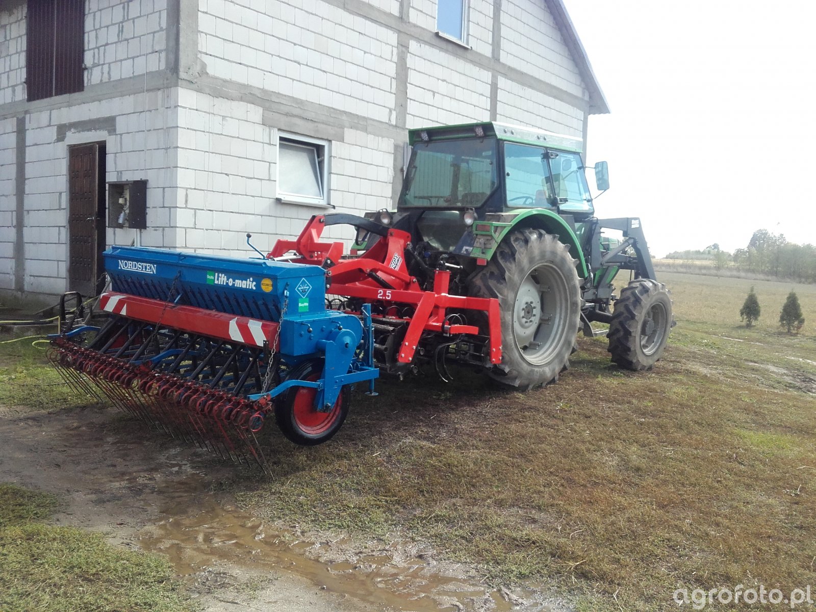 Ciągnik Deutz-Fahr DX4.50 pracuje na placu gospodarstwa, współpracując z siewnikiem Nordsten. Wyposażony w silnik tego uznanego producenta, o mocy około 75 KM i czterocylindrowej konstrukcji, ten traktor doskonale radzi sobie z różnorodnymi zadaniami rolniczymi. Skrzynia biegów 16/8 zapewnia precyzyjne dostosowanie prędkości do specyfiki pracy w polu. Dzięki swojej konstrukcji, ciągnik perfekcyjnie obsługuje maszyny towarzyszące, takie jak Nordsten, umożliwiając efektywne sianie na dużych obszarach. Precyzyjne połączenie mocy i wydajności czyni go idealnym narzędziem dla średnich gospodarstw, zajmujących się intensywną uprawą roślin.