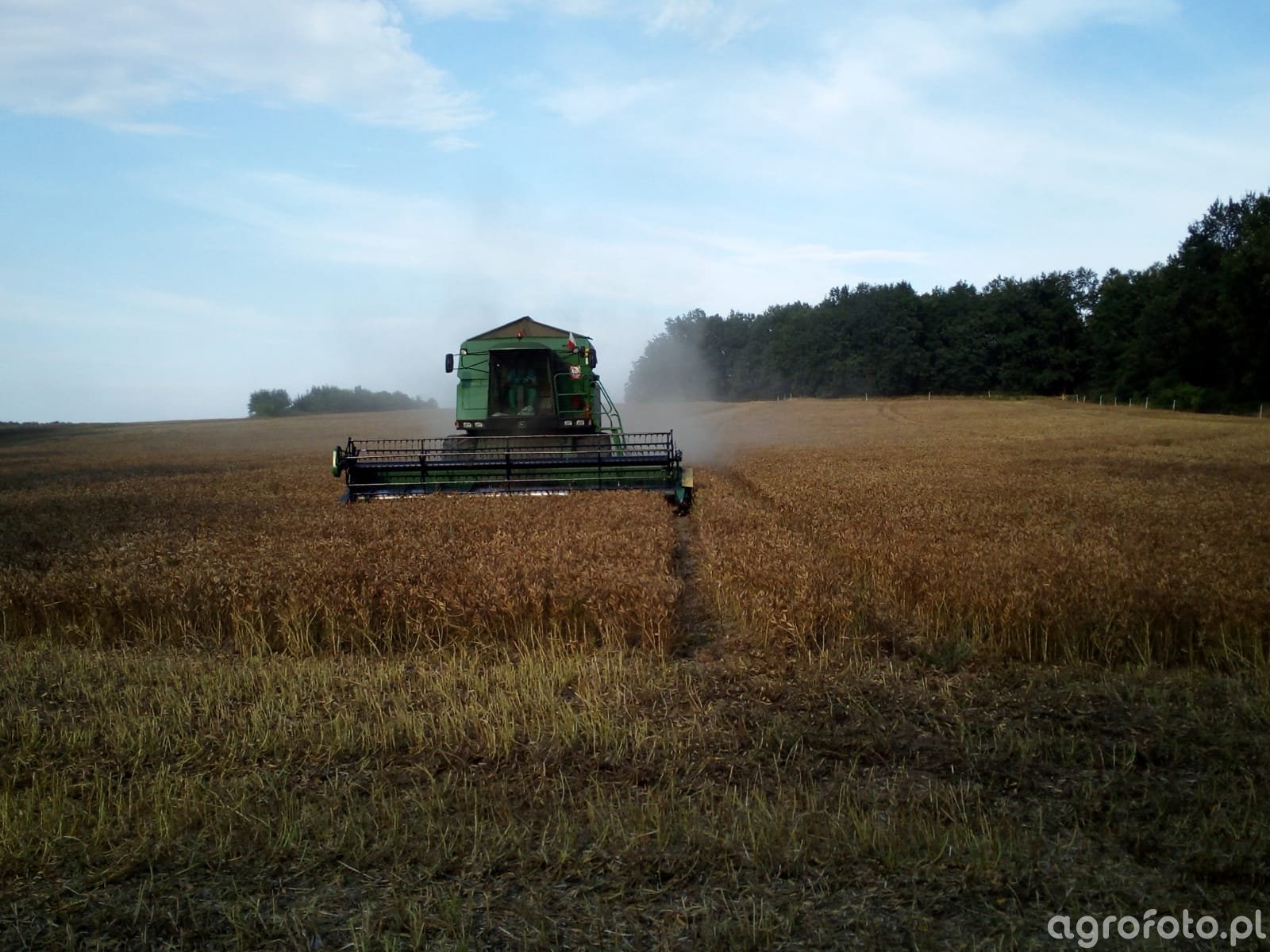 Kombajn John Deere 2264 podczas koszenia zbóż na polu. Maszyna jest napędzana silnikiem o mocy około 335 KM, co umożliwia efektywną pracę w trudnych warunkach żniwnych. System omłotu składa się z bębna omłotowego i separatora odrzutowego, co zapewnia wysoką wydajność oraz precyzję w oddzielaniu ziarna od słomy. Zbiornik ziarna o pojemności 8 500 litrów pozwala na długotrwałe operacje bez konieczności częstego rozładunku. Widoczny heder z motowidłami o szerokości roboczej 6,7 metra umożliwia szybkie i efektywne koszenie szerokiego pasa zboża, co znacznie przyspiesza prace polowe w pełni sezonu żniwnego. Kombajn działa na rozległym polu otoczonym linią drzew, typowym dla regionów rolniczych, zapewniając nieprzerwane tempo pracy.