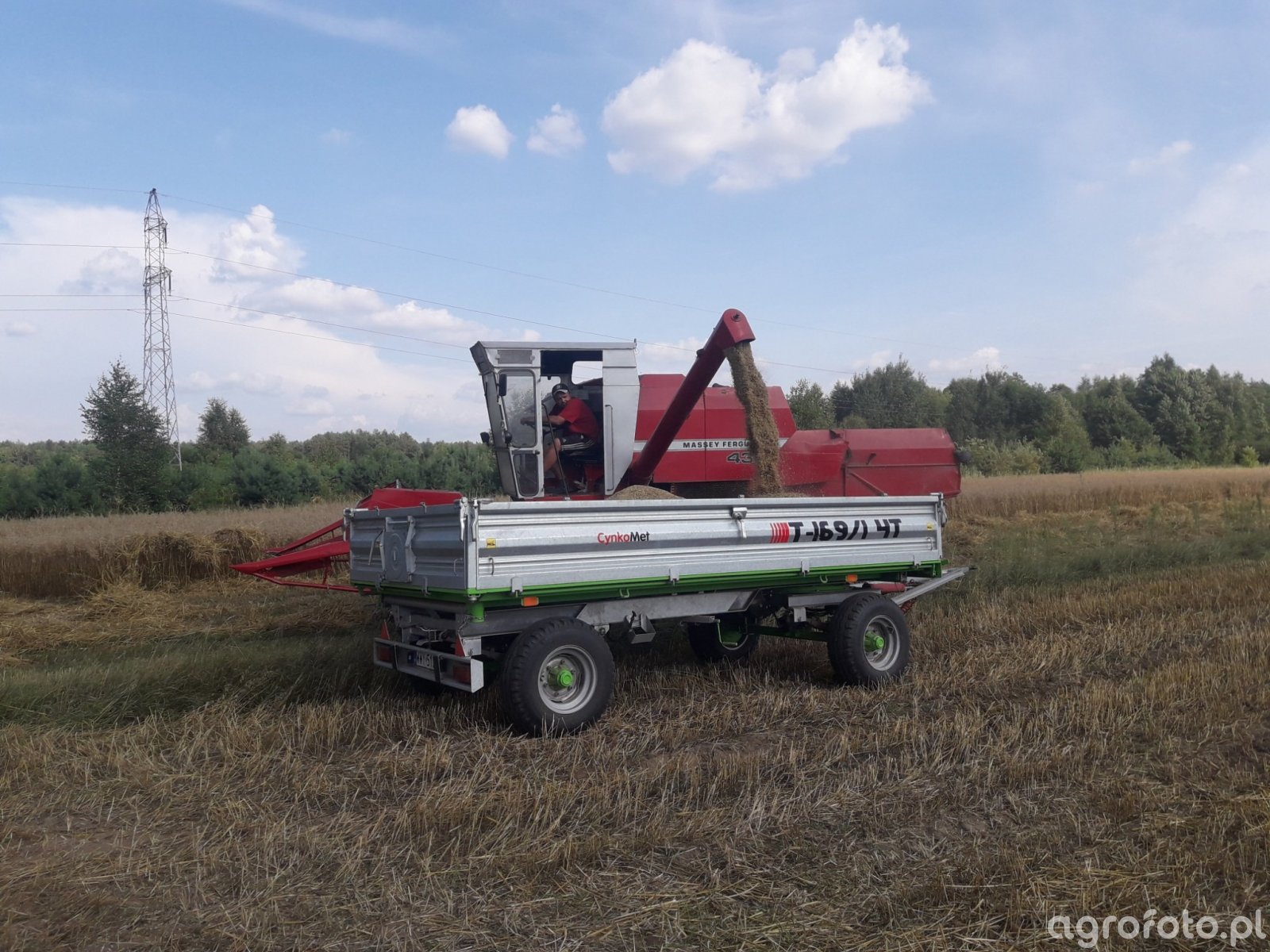 Kombajn Massey Ferguson 430 podczas prac żniwnych na polu. Na zdjęciu widać maszynę wysypującą zebrane ziarno do przyczepy transportowej. Massey Ferguson 430 to kombajn zbożowy wyposażony w heder z motowidłami, co wskazuje na jego zastosowanie w koszeniu zbóż. Silnik o mocy około 100 KM zasila system młócenia tradycyjnego, który umożliwia efektywną pracę na średnich polach. Pojemność zbiornika na ziarno pozwala na zebranie znacznej ilości plonów przed koniecznością opróżnienia. Otoczenie to typowe pole zbożowe z widocznym ścierniskowym podłożem, co dodatkowo podkreśla zastosowanie kombajnu w intensywnym cyklu żniwnym.