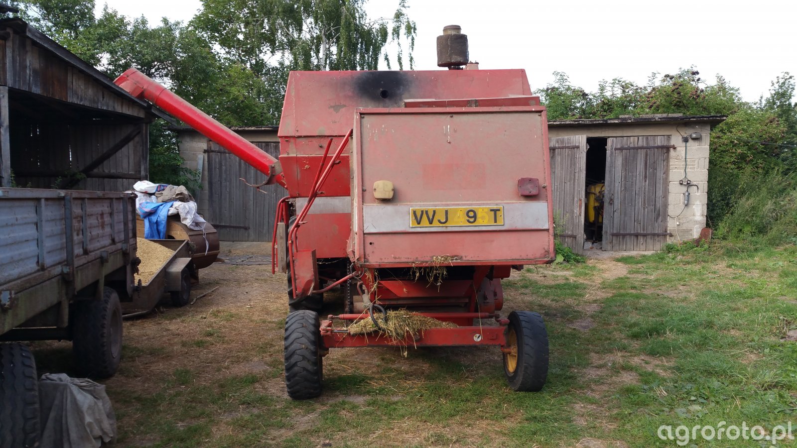Kombajn zbożowy Massey Ferguson MF 307 widoczny na zdjęciu znajduje się w spoczynku na terenie gospodarstwa. Ten model, charakterystyczny dla linii kombajnów MF produkowanych w latach 80., wyposażony jest w bęben młócący o szerokości, która zapewnia efektywne omłotwanie różnych zbóż. Silnik Perkins o mocy około 90 KM napędza mechanizmy maszyny, umożliwiając sprawne prace żniwne. Pojemność zbiornika na ziarno sięga 2300 litrów, co pozwala na dłuższą pracę bez konieczności częstego wyładunku. Na zdjęciu widoczny jest standardowy heder z motowidłami, co sugeruje, że kombajn przeznaczony jest do pracy w zbożach. Wyposażenie obejmuje typową dla tej serii konstrukcję, która podkreśla niezawodność i wydajność w codziennych obowiązkach rolniczych.