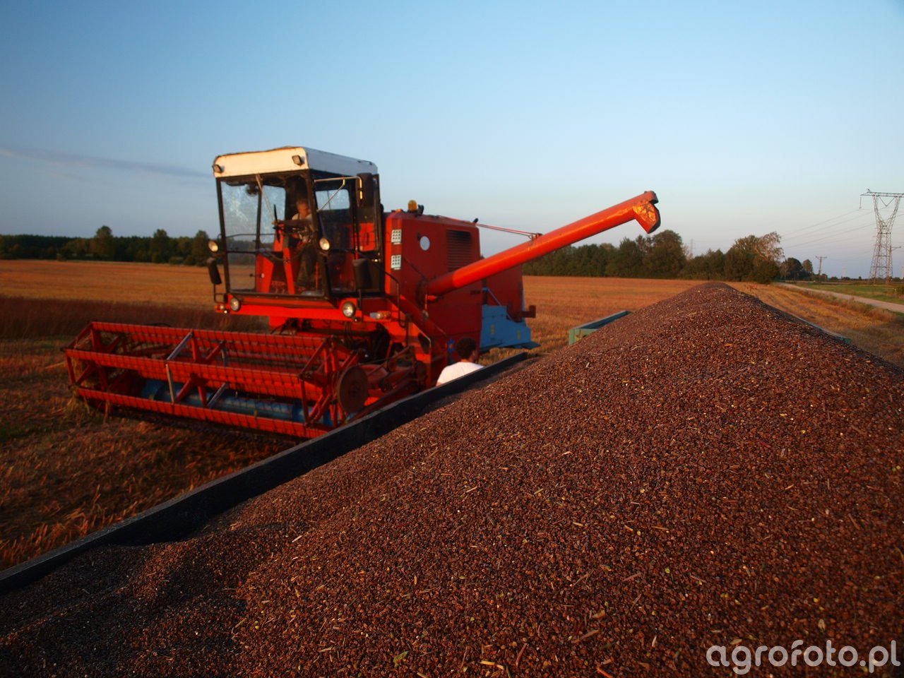 Kombajn Bizon Super Z056 podczas prac żniwnych na polu. Maszyna wyposażona jest w heder z motowidłami, co wskazuje na koszenie zbóż, prawdopodobnie gryki, biorąc pod uwagę ułożenie ziarna na przyczepie obok. Napędzany silnikiem 6-cylindrowym o mocy 100 KM, Bizon Z056 oferuje solidne osiągi w żniwach. System omłotu bębnowego i pojemność zbiornika wynosząca 2 100 litrów pozwalają na efektywną pracę bez częstych przerw. Na zdjęciu kombajn znajduje się na ściernisku, co podkreśla kontekst intensywnej pracy na polu w promieniach zachodzącego słońca.