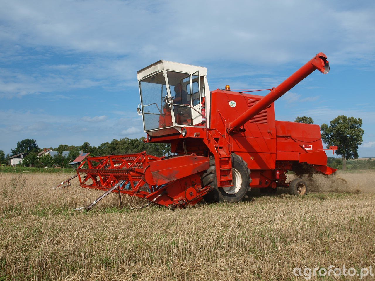 Kombajn Bizon Super Z056 podczas koszenia zboża na polu. Maszyna charakterystyczna dla swojej czerwono-białej kolorystyki, jest wyposażona w tradycyjny heder z motowidłami, co pozwala na efektywne żniwa zbożowe. Kombajn napędzany jest silnikiem S4003 o mocy około 100 KM, co zapewnia odpowiednią wydajność w pracy polowej. Posiada system omłotu bębnowo-klawiszowego, który skutecznie oddziela ziarno od plew. Zbiornik ziarna o pojemności 3000 litrów umożliwia długotrwałą pracę bez potrzeby częstego rozładunku. Konstrukcja kabiny zapewnia operatorowi dobrą widoczność i komfort podczas żniw, a solidne podwozie dobrze radzi sobie podczas manewrowania na różnorodnym terenie.