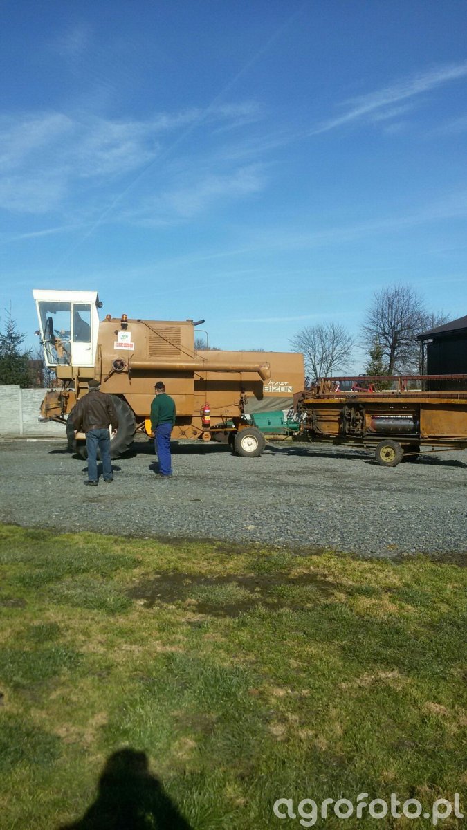 Kombajn zbożowy Bizon Super Z056 na tle placu gospodarstwa. Maszyna ta, popularna w polskich gospodarstwach, wyposażona jest w heder z motowidłami, co pozwala na efektywne koszenie zbóż. Napędzany czterocylindrowym silnikiem o mocy 100 KM, kombajn ten umożliwia pracę w różnych warunkach polowych dzięki standardowemu układowi omłotu bębnowego. Zbiornik ziarna o pojemności 3000 litrów pozwala na długie sesje żniwne bez częstych przestojów. Konstrukcja Bizona z charakterystyczną kabiną i klasycznym kolorem zapewnia mu rozpoznawalność i solidność podczas prac w polu.