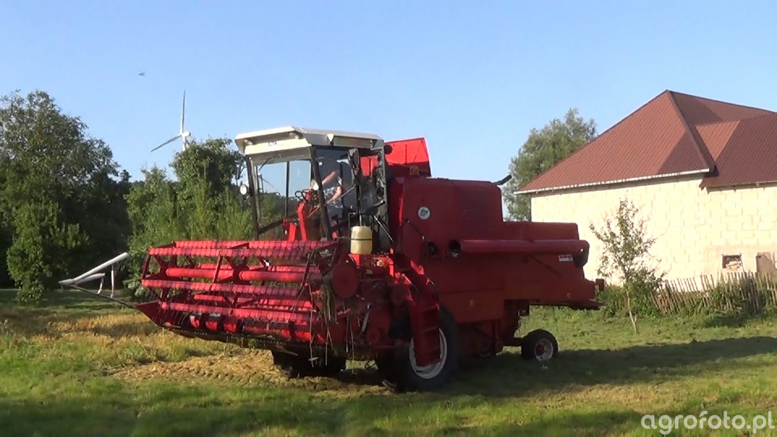 Kombajn Bizon Super Z056 w trakcie prac żniwnych na polu zboża. Maszyna, charakteryzująca się rozpoznawalną czerwoną kolorystyką, jest wyposażona w heder z motowidłami, co wskazuje na zbiór zbóż. Bizon Super Z056 zasilany jest silnikiem SW 400 o mocy 100 KM, który napędza bęben młócący o szerokości 1,2 m, co zapewnia efektywny proces omłotu. Zbiornik ziarna o pojemności 2,5 tony pozwala na dłuższą pracę bez potrzeby częstego opróżniania. Kombajn pracuje na ściernisku otoczonym zielenią, co podkreśla jego typowe środowisko pracy na polskiej wsi.