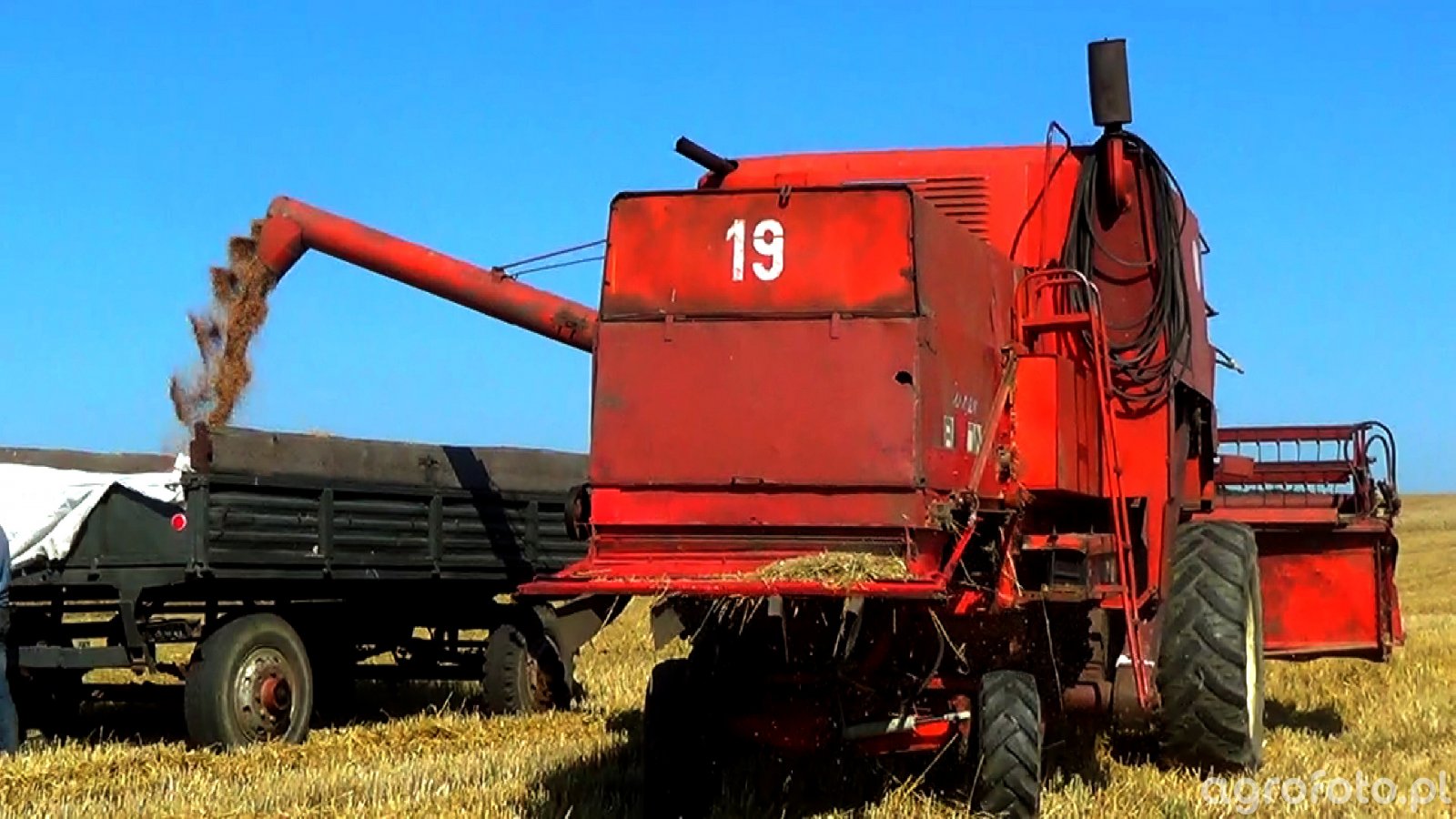 Kombajn Bizon Super Z056 w trakcie rozładunku zboża na ściernisku. Charakterystyczny czerwony kolor konstrukcji i masywna sylwetka tej polskiej maszyny wskazują na popularny model przeznaczony do pracy w średnich gospodarstwach. Wyposażony w silnik SW400 o mocy 100 KM pozwala na wydajną pracę podczas żniw. Posiada konwencjonalny bębenowy system omłotu oraz zbiornik na ziarno o pojemności 2 500 litrów, co umożliwia efektywne koszenie i rozładunek bez częstych przestojów. Kombajn znajduje się na ściernisku, a zboże transportowane jest bezpośrednio do przyczepy, co optymalizuje czas pracy w polu.