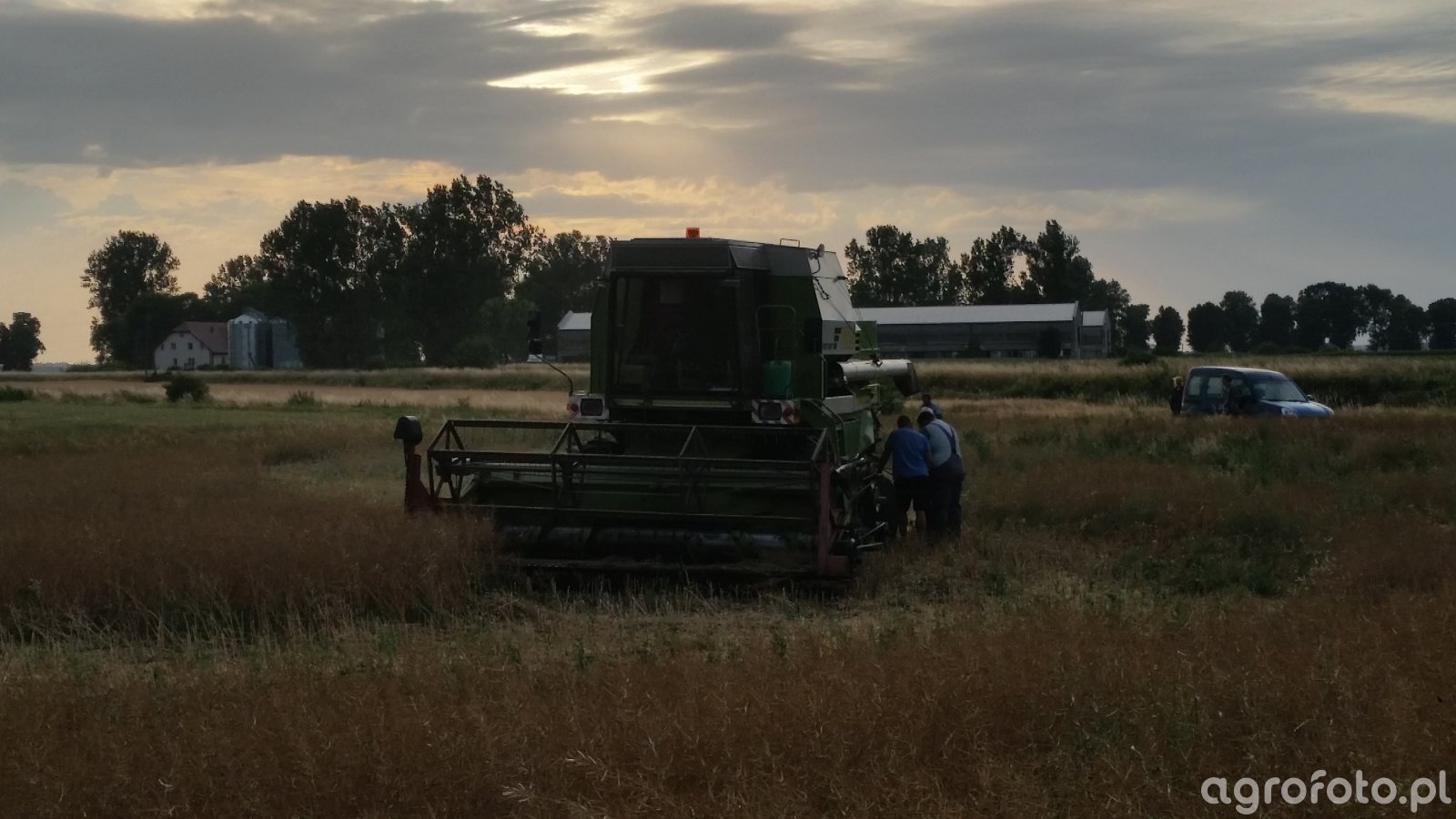 Kombajn Fortschritt E 514 podczas prac żniwnych na polu zboża. Maszyna znana jest z silnika o mocy około 105 KM, co zapewnia odpowiednią moc do efektywnego koszenia. Posiada system omłotu bębnowego oraz zbiornik na ziarno o pojemności około 4 200 litrów. Na zdjęciu widoczne jest użycie hedera z motowidłami, wskazującego na koszenie zbóż. Kombajn pracuje w krajobrazie wiejskim, otoczony naturalnym pejzażem pól, z widocznymi budynkami gospodarczymi w tle. Tło tworzy atmosferę typową dla intensywnych prac rolnych w sezonie zbioru, kiedy efektywność i niezawodność maszyn mają kluczowe znaczenie dla rolników.