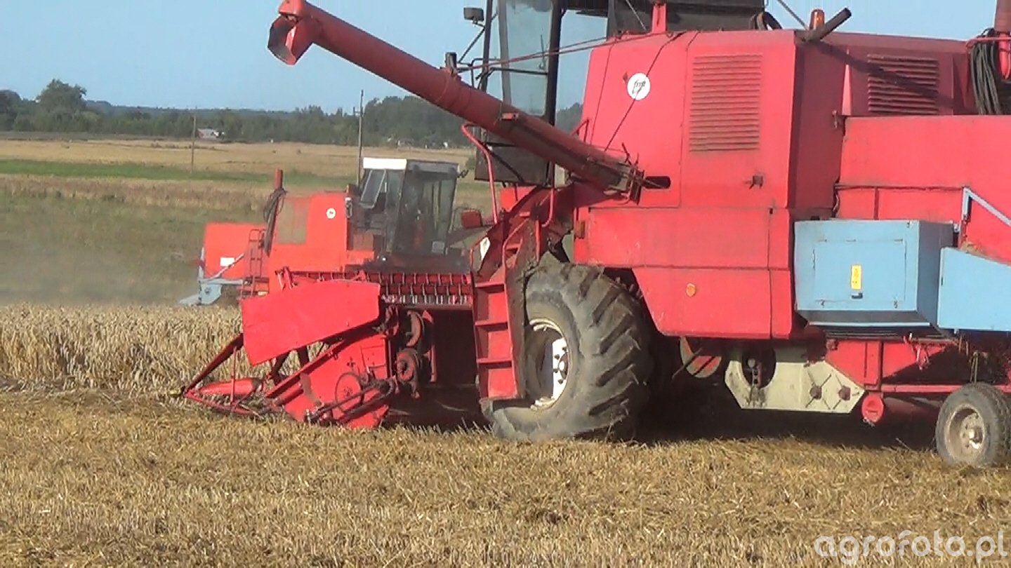 Kombajn Bizon Super Z056 podczas koszenia zbóż na polu. Maszyna, charakterystyczna dzięki swojej czerwonej kolorystyce i solidnej konstrukcji, jest wyposażona w heder z motowidłami, co umożliwia efektywne żniwa. Napędzany czterocylindrowym silnikiem SW 400 o mocy 105 KM, kombajn oferuje niezawodną wydajność podczas zbioru. System omłotu w Bizonie Z056 wykorzystuje bęben o szerokości 1,25 m i średnicy 0,6 m, co pozwala na skuteczne separowanie ziarna. Zbiornik na ziarno o pojemności 3000 litrów umożliwia dłuższe okresy pracy bez konieczności częstego opróżniania. Obraz przedstawia maszynę w pełni działania na polu z dojrzałym zbożem, co podkreśla jej rolę jako niezastąpionego narzędzia w gospodarstwach rolnych podczas sezonu żniwnego.