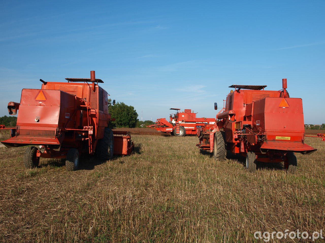 Kombajn Bizon Super Z056 podczas żniw na polu zbóż. Charakterystyczna pomarańczowa kolorystyka oraz konstrukcja maszyny pozwalają na jednoznaczną identyfikację modelu. Bizon Super Z056 jest wyposażony w silnik wysokoprężny SW400 o mocy około 100 KM, co zapewnia efektywną pracę na polu. Maszyna posiada heder z motowidłami, który umożliwia skuteczne koszenie zboża. Zbiornik na ziarno o pojemności 3000 litrów pozwala na dłuższą pracę bez konieczności częstego opróżniania. Na fotografii widoczne są dwa identyczne kombajny w trakcie działań żniwnych, co tworzy realistyczny obraz pracy w polu, na tle błękitnego nieba i otwartej przestrzeni ścierniska.