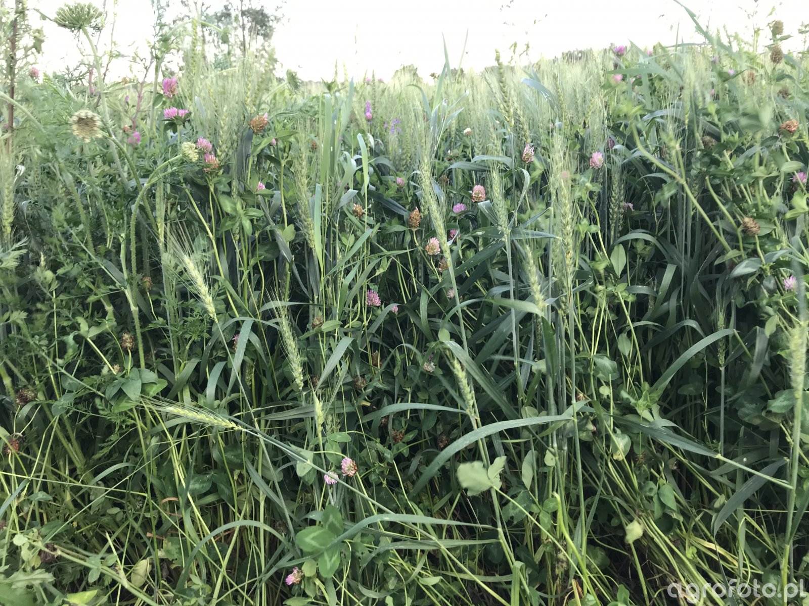 Sucho. Długie wschody pszenicy. Mało chwastów poza koniczyną.
