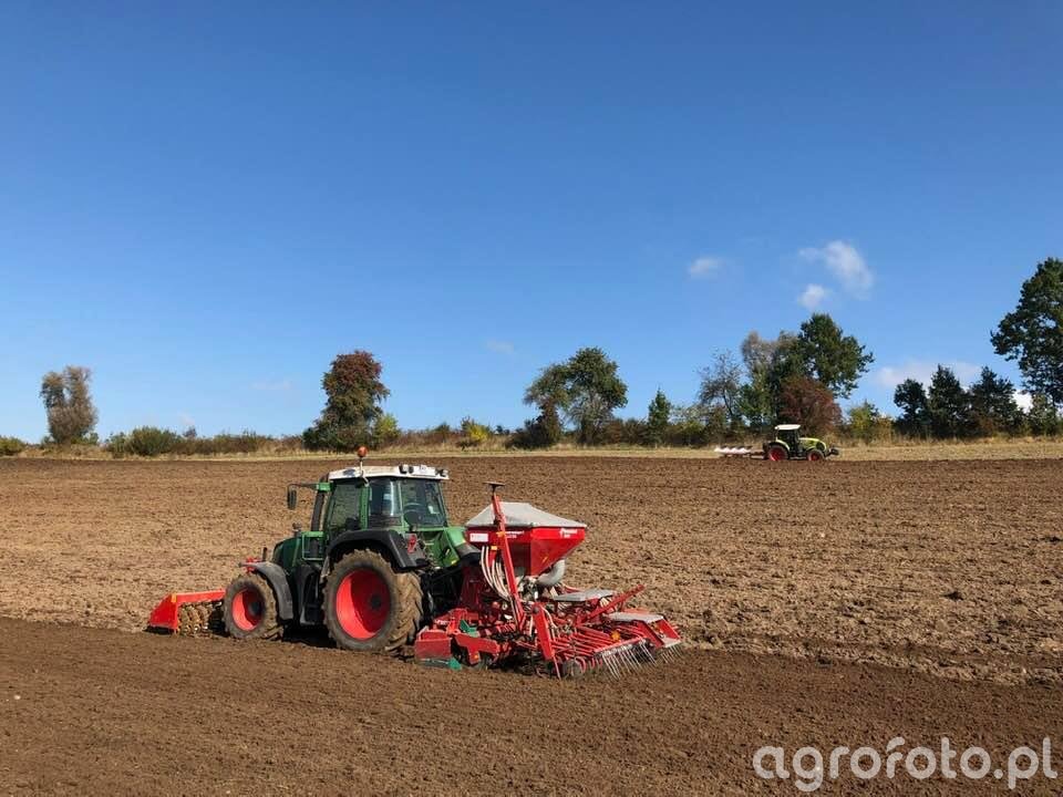 Ciągnik Fendt 718 Vario pracuje na polu podczas siewu pszenicy, współpracując z siewnikiem. Moc znamionowa 180 KM i bezstopniowa skrzynia biegów Vario zapewniają płynność pracy i efektywne zarządzanie dużymi obciążeniami. Zaawansowany silnik Deutz z sześcioma cylindrami i pojemnością 6,1 litra umożliwia elastyczność i oszczędność paliwa, kluczowe na dużych areałach. Dzięki wysokiemu maksymalnemu udźwigowi tylnego TUZ, maszyna radzi sobie z różnorodnymi narzędziami rolniczymi, co przekłada się na efektywność procesów agrotechnicznych.
