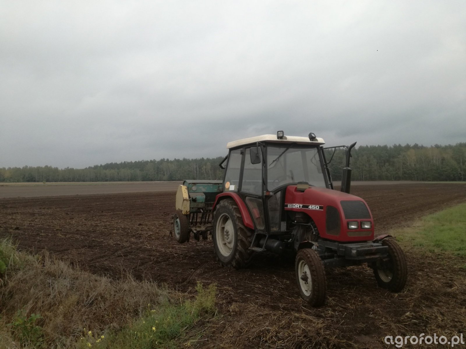 Ciągnik Escort 450 wykonuje prace polowe, współpracując z siewnikiem Poznaniak podczas siewu pszenżyta. Model ten, wyposażony w silnik o mocy około 45 KM, doskonale sprawdza się w pracy na średniej wielkości gospodarstwach. Czterocylindrowy silnik i mechaniczna skrzynia biegów zapewniają płynność i efektywność podczas zasiewu. Dzięki tym parametrom maszyna może skutecznie współpracować z różnorodnym osprzętem, wykorzystując swoją zdolność do efektywnej pracy polowej. Szczegóły konstrukcji pozwalają na łatwe manewrowanie, co jest kluczowe podczas pracy z siewnikiem w zmiennym terenie.