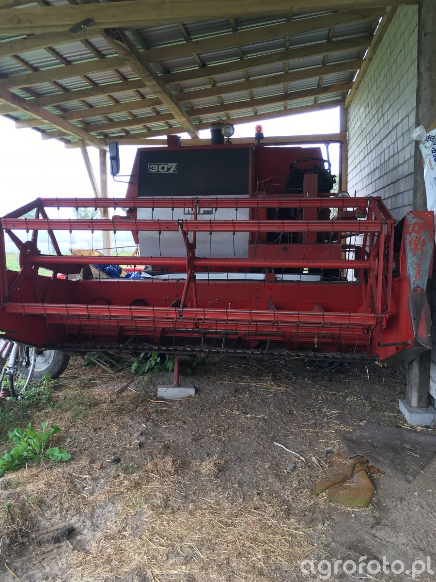 Kombajn Massey Ferguson 307 prezentowany na zdjęciu znajduje się w zadaszonym miejscu, prawdopodobnie w gospodarstwie środkowoeuropejskim, co sugeruje jego wykorzystanie do prac polowych na tym terenie. Czerwona konstrukcja kombajnu, charakterystyczna dla serii Massey Ferguson, łączy w sobie wytrzymałość i techniczną precyzję. Maszyna wyposażona jest w heder z motowidłami, co wskazuje na jej zastosowanie przede wszystkim do koszenia zbóż. Model 307 jest znany z wykorzystania niezawodnego silnika Diesla o mocy około 100 KM, który wspiera mechaniczny system omłotu. Pojemność zbiornika na ziarno wynosząca kilkaset litrów pozwala na efektywną pracę w polu bez częstego przerywania na opróżnianie. Ten kombajn jest przystosowany do pracy na średnich i małych gospodarstwach, dzięki czemu stanowi istotny element wyposażenia wielu rolników, dbając o efektywne zbiory na mniejszych polach.