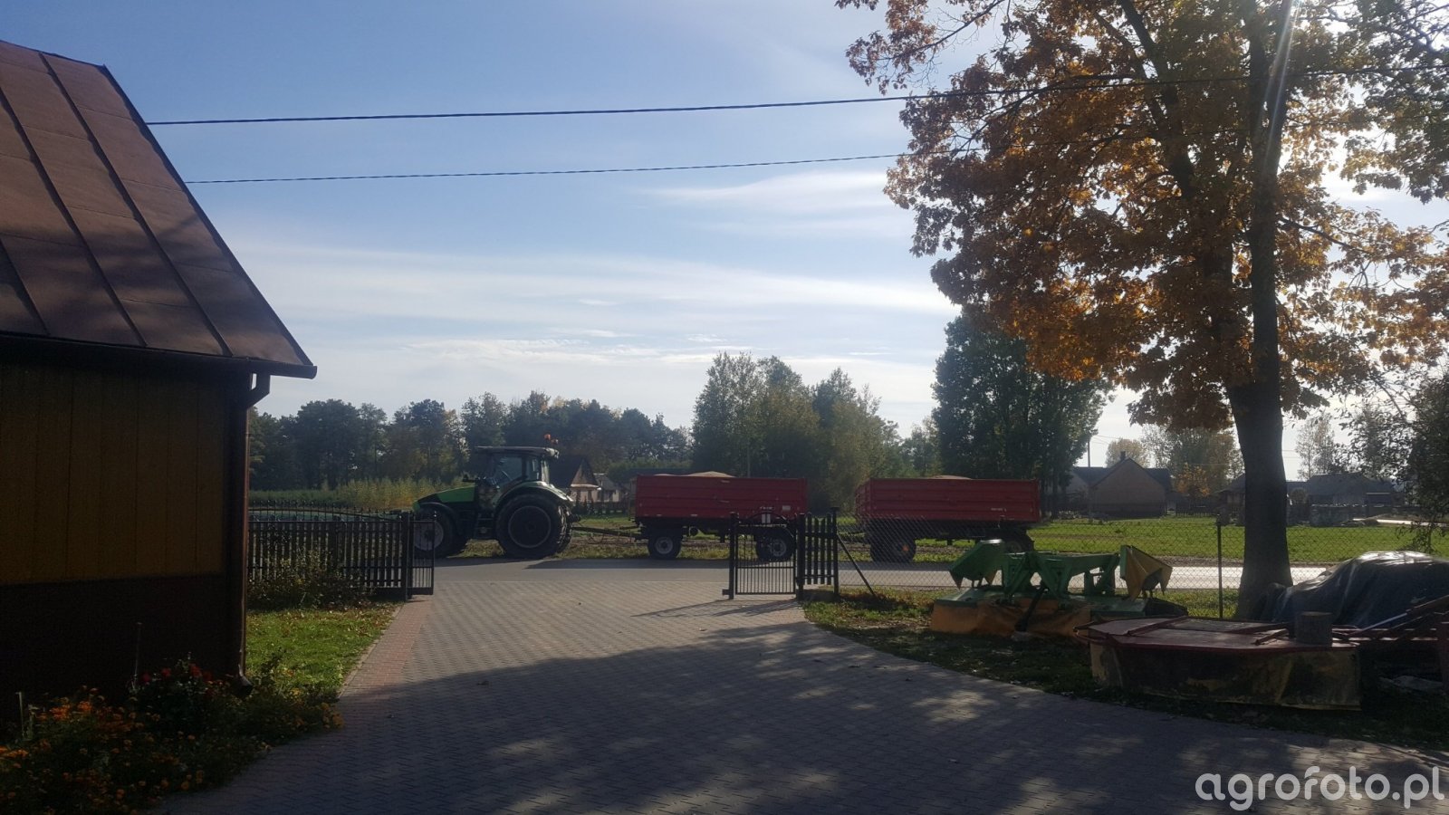 Ciągnik Deutz-Fahr widoczny na placu gospodarstwa, współpracuje z przyczepą rolniczą. Maszyna ta charakteryzuje się mocą znamionową wynoszącą 150 KM, co umożliwia efektywne holowanie ładunków podczas prac polowych i transportowych. Zastosowany w niej sześciocylindrowy silnik o pojemności skokowej 6.1 litra, produkowany przez markę Deutz, zapewnia niezawodne działanie nawet w trudnych warunkach terenowych. Ciągnik ten jest również wyposażony w nowoczesną skrzynię biegów typu Powershift 24/24, co pozwala na precyzyjną kontrolę prędkości i mocy podczas manewrowania z przyczepą.