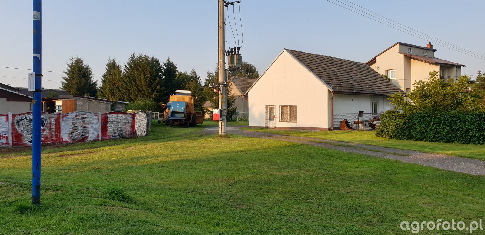 Na zdjęciu widoczny jest kombajn Bizon, prawdopodobnie model z serii Rekord, charakteryzujący się tradycyjną, niebiesko-żółtą kolorystyką. Maszyna znajduje się w pobliżu gospodarstwa, w stanie spoczynku, co sugeruje otoczenie trawnika oraz brak widocznych śladów pracy polowej w okolicy. Kombajny Bizon z serii Rekord były popularne w latach 80. i 90. XX wieku w Polsce, wyposażone w silnik o mocy około 150 KM, z pojemnością zbiornika ziarna wynoszącą 3 000 litrów. W zależności od wyposażenia, mogły posiadać różne typy hederów, jednak bez wyraźnego widoku motowideł na zdjęciu, trudno określić typ operacji żniwnej. Obecność kombajnu w pobliżu budynków gospodarczych może wskazywać na jego przygotowywanie do sezonu żniwnego lub zakończenie bieżących prac rolno-zbożowych.