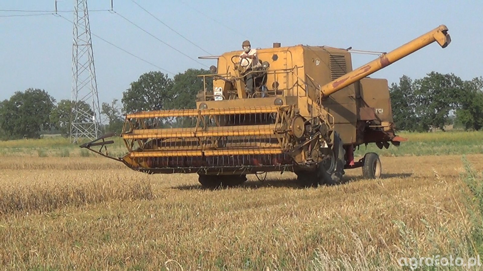 Kombajn Bizon Super Z056 podczas koszenia zbóż na otwartym polu. Maszyna, charakterystyczna dla polskiego rolnictwa, wykorzystuje mechaniczny system omłotu oparty na bębnie młócącym, co pozwala na efektywne oddzielanie ziaren od kłosów. Bizon Z056 jest wyposażony w silnik o mocy 100 KM, co zapewnia wystarczającą siłę do pracy na różnorodnych terenach rolniczych. Zbiornik na ziarno o pojemności 3 540 litrów umożliwia dłuższe okresy pracy bez konieczności częstego opróżniania, co zwiększa wydajność podczas żniw. Heder z motowidłami, widoczny na fotografii, jest idealnie dostosowany do koszenia różnorodnych zbóż. Kombajn pracuje na ściernisku, co dodatkowo podkreśla intensywność sezonu żniwnego. Stalowa konstrukcja i żółta kolorystyka to znak rozpoznawczy tej legendarnej maszyny, doskonale wpisującej się w krajobraz polskiej wsi.