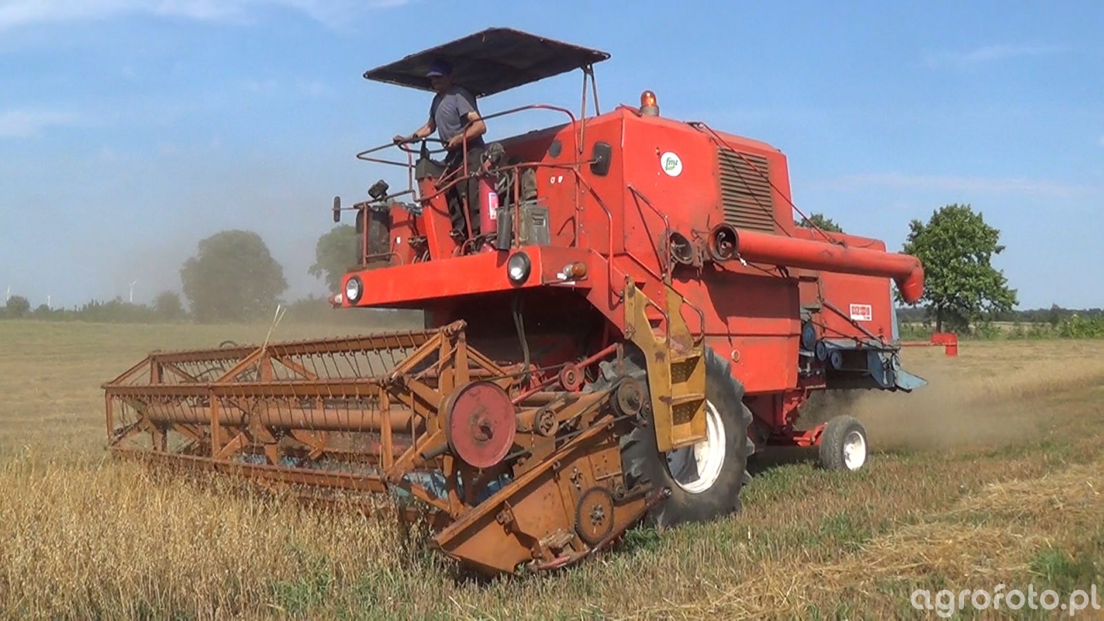 Kombajn Bizon Super Z056 podczas koszenia zboża na polu. Maszyna charakteryzuje się hederem z motowidłami, który skutecznie kosi łany zboża. Wyposażony w silnik S-4002 o mocy 100 KM, Bizon Super Z056 umożliwia efektywną pracę nawet na dużych areałach. Zbiornik na ziarno o pojemności około 2 540 litrów zapewnia wydłużony czas pracy bez konieczności częstego rozładunku. System omłotu oparty na klasycznym układzie bębnowym z siekaczem słomy dodatkowo podkreśla jego wydajność podczas żniw. Charakterystyczna czerwona kolorystyka i solidna konstrukcja podkreślają profesjonalny charakter tej maszyny, cenionej na polskich polach za niezawodność i prostotę obsługi.
