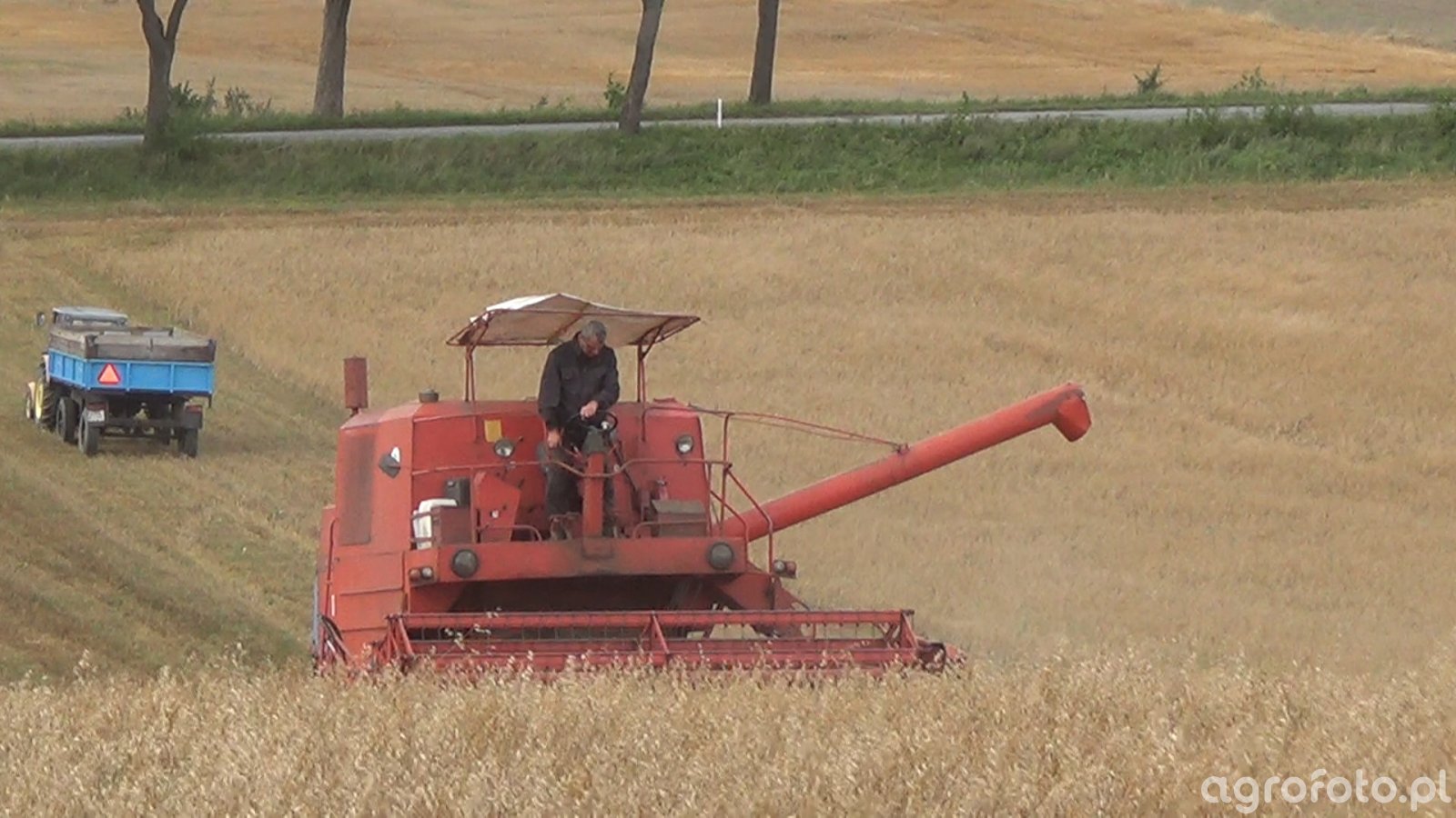 Kombajn Bizon Super Z056 podczas żniw na polu zbożowym. Maszyna wyposażona jest w heder z motowidłami, co wskazuje na koszenie zbóż. Bizon Super Z056 jest napędzany silnikiem SW 400 o mocy około 100 KM, a jego zbiornik na ziarno mieści 2 540 litrów, co pozwala na wydajną pracę w sezonie żniwnym. Kombajn ten cechuje się bębnowym systemem omłotu i szerokością hedera wynoszącą 4,2 metra, co wspomaga efektywne zbieranie plonów na średniej wielkości polach. Praca na tle malowniczego pola zbożowego doskonale ilustruje typowy dzień w sezonie żniw, gdzie każda godzina ma kluczowe znaczenie dla maksymalizacji wydajności.