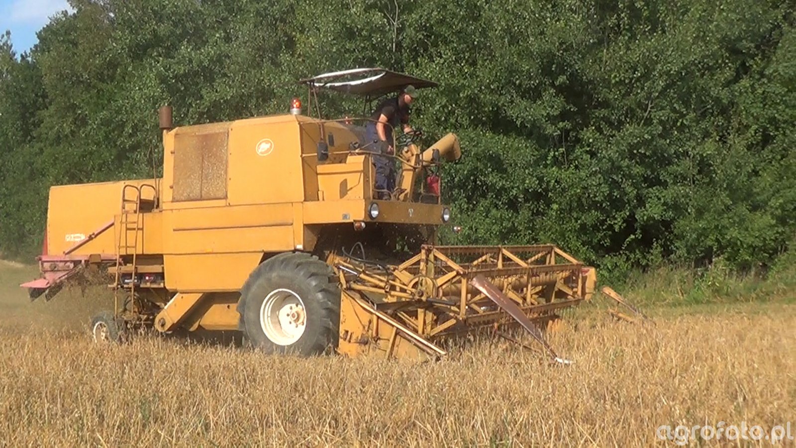 Kombajn Bizon Super Z056 podczas koszenia zboża na polu. Maszyna charakteryzuje się klasycznym wzornictwem z dominującą żółtą kolorystyką, która jest typowa dla tej serii. Wyposażony w heder z motowidłami, Bizon Super Z056 efektywnie przeprowadza prace żniwne dzięki wydajnemu układowi młocarni bębnowej. Kombajn z silnikiem o mocy 100 KM i pojemności zbiornika na ziarno wynoszącej 2 540 litrów jest przystosowany do intensywnego użytkowania na dużych powierzchniach. Widoczna konstrukcja podkreśla jego solidność, a obecność operatora na otwartej kabinie sugeruje kontrolę podczas pracy w naturalnym otoczeniu polnym, co jest typowe dla maszyn tego modelu.
