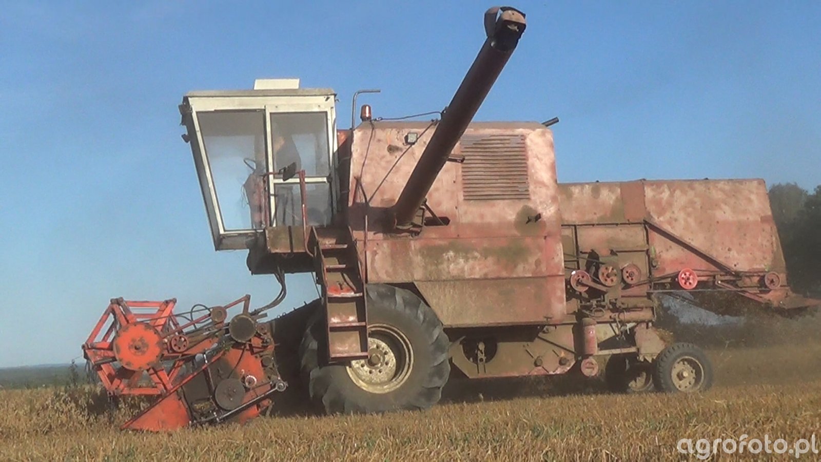 Kombajn Bizon Super Z056 podczas prac żniwnych na polu zboża. Maszyna, charakterystyczna dla polskiej inżynierii rolniczej, wyposażona jest w heder z motowidłami, co pozwala na efektywne koszenie zbóż. Bizon Super Z056 napędzany jest sześciocylindrowym silnikiem o mocy 100 KM, co zapewnia wystarczającą siłę do obsługi systemu omłotu. Zbiornik ziarna o pojemności około 3 000 litrów umożliwia dłuższe okresy pracy bez konieczności wyładunku. Szerokość hedera wynosząca 4,2 metra pozwala na efektywne koszenie dużych areałów, a wytrzymała konstrukcja umożliwia pracę w różnorodnych warunkach polowych. Kombajn Bizon to symbol solidności i trwałości, ceniony przez rolników za niezawodność i prostotę obsługi.