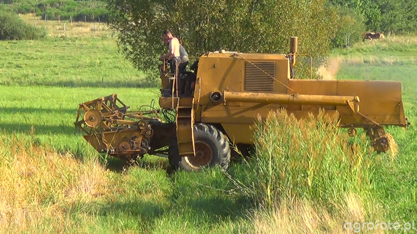 Kombajn Bizon Super Z056 podczas prac żniwnych na polu zboża. Ten klasyczny polski kombajn, ceniony za swoją niezawodność, wyposażony jest w silnik o mocy około 100 KM, co pozwala na skuteczne napędzanie aparatów tnących i systemu omłotu. Hedera z motowidłami, przypisana do zbioru zbóż, efektywnie kosi trawy i zboża na polu. Zbiornik o pojemności około 3000 litrów umożliwia sprawną pracę przez dłuższy czas bez potrzeby częstego rozładunku. Maszyna pokazana jest w otoczeniu zielonych pól, co podkreśla jej zastosowanie w typowych warunkach rolniczych. Bizon Super Z056 jest symbolem polskiej inżynierii rolniczej, łącząc praktyczność z wydajnością.