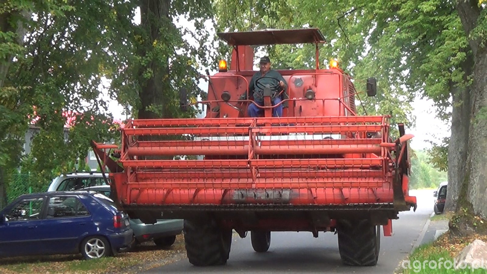 Kombajn Bizon Super Z056 podczas przemieszczania się drogą dojazdową. Charakterystyczna konstrukcja maszyny o czerwonym kolorze oraz widoczny logotyp pozwalają zidentyfikować model Super Z056, popularny w polskim rolnictwie. Maszyna wyposażona jest w heder z motowidłami, co sugeruje, że jest przeznaczona do koszenia zbóż. Kombajn napędzany jest silnikiem o mocy około 100 KM, a jego zbiornik na ziarno ma pojemność 2540 litrów. System omłotu w tej serii wykorzystuje tradycyjne bębny młócące, zapewniając efektywne oddzielanie ziarna. Przejazd drogą w otoczeniu zieleni i zaparkowanych pojazdów wskazuje na przygotowania do rozpoczęcia prac żniwnych lub powrót do gospodarstwa po ich zakończeniu.