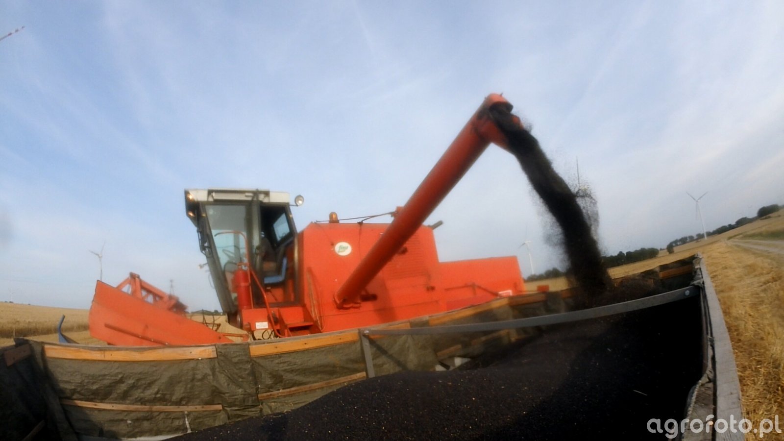 Kombajn Bizon Super Z056 podczas rozładunku ziarna na polu. Maszyna charakterystyczna dzięki swojej czerwonej kolorystyce i prostej kabinie, pracuje przy wykorzystaniu silnika SW 400 o mocy 100 KM. Bizon Super Z056 jest wyposażony w bębnowy system omłotu i może pomieścić w zbiorniku do 3 000 litrów ziarna. Na zdjęciu widoczna jest praca hedera z motowidłami, co sugeruje koszenie tradycyjnych zbóż. Kombajn znajduje się w trakcie pracy żniwnej, otoczony przez charakterystyczne pola oraz widoczne w tle wiatraki, co podkreśla kontekst rolniczy i nowoczesne zastosowanie energii odnawialnej. Rozładunek ziarna odbywa się bezpośrednio na polu, co jest typowe dla efektywnego gospodarowania w czasie żniw.