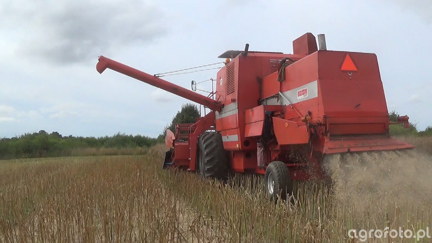 Kombajn Bizon Super Z056/7 podczas prac żniwnych na polu zboża. Ta maszyna jest wyposażona w sześciocylindrowy silnik o mocy 100 KM, co pozwala na efektywne wykonywanie zadań na polu. Kombajn posiada bęben o średnicy 600 mm i szerokości 1250 mm, który umożliwia precyzyjny omłot ziarna. Zbiornik ziarna o pojemności 3000 litrów pozwala na długą pracę bez potrzeby częstego rozładunku. Widoczny na zdjęciu heder z motowidłami wskazuje na przeznaczenie maszyny do koszenia zbóż. Złote, dojrzałe zboże i otaczające pole tworzą charakterystyczny dla żniw letni krajobraz.