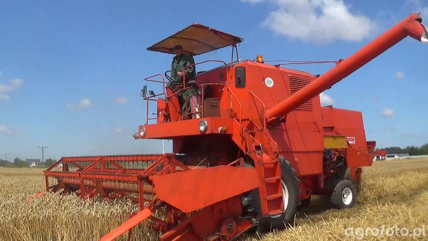 Kombajn Bizon Super Z056 podczas koszenia zbóż na polu. To klasyczna maszyna rolnicza znana z charakterystycznej czerwono-pomarańczowej konstrukcji, idealnej do polskich warunków polowych. Bizon Super Z056 jest wyposażony w silnik typu SW 400 o mocy 100 KM, który efektywnie napędza heder z motowidłami, umożliwiając precyzyjne zbiory. Maszyna dysponuje bębnowym systemem omłotu oraz zbiornikiem na ziarno o pojemności około 3 000 litrów, co pozwala na długie, nieprzerwane prace podczas żniw. Dodatkowo zintegrowany mechanizm rozładunku zwiększa wydajność i ułatwia transport zebranych upraw. Kombajn operuje na szerokim ściernisku, co w połączeniu z doskonałą widocznością z kabiny operatora, gwarantuje wysoką efektywność pracy.