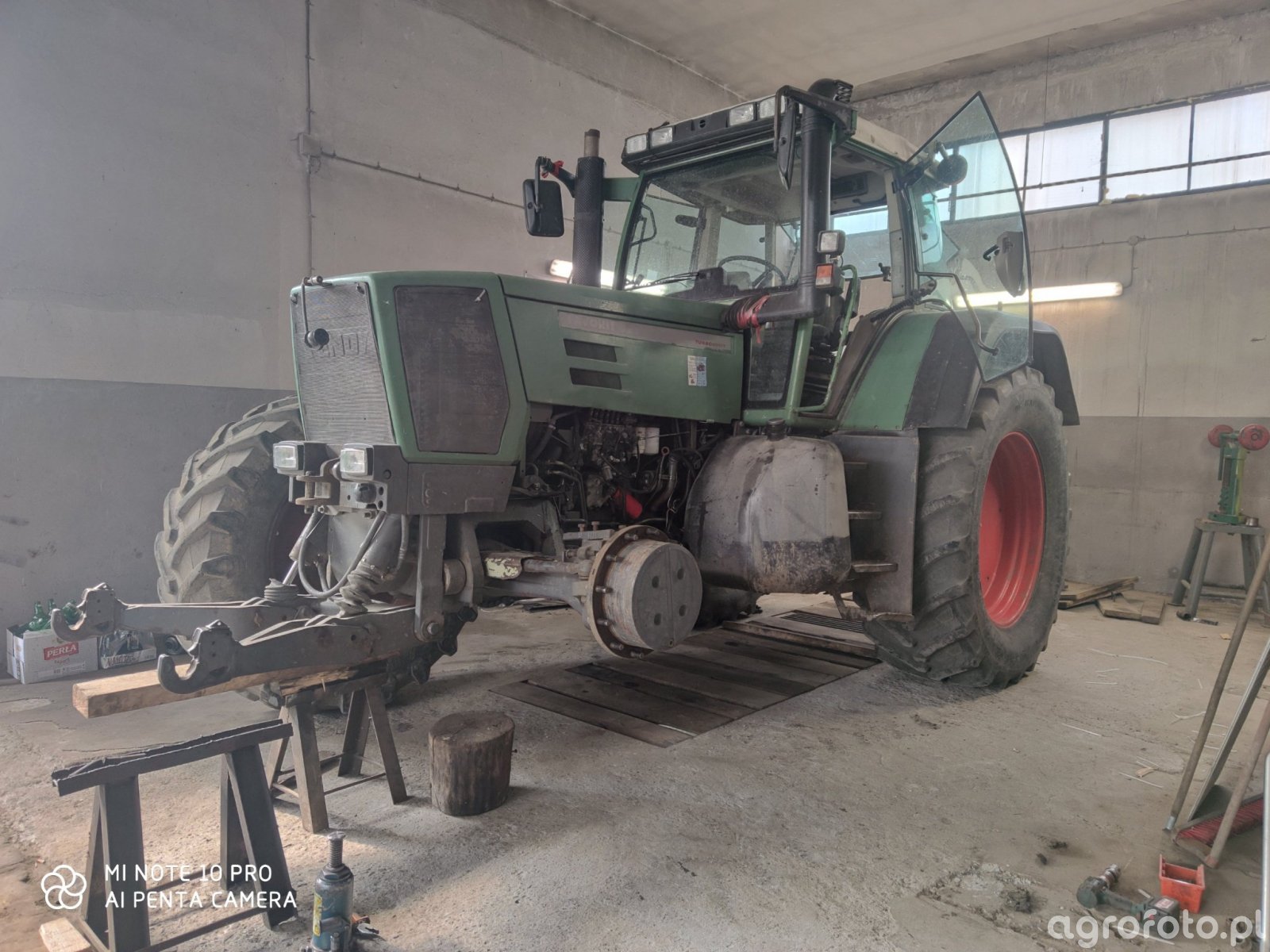 Ciągnik Fendt 824, należący do serii Favorit, uchwycony podczas pracy na placu gospodarstwa. Ten model wyposażony jest w potężny silnik Deutz o mocy 240 KM i pojemności skokowej 6,06 litra, co pozwala na efektywną obsługę wymagających zadań rolniczych. Dzięki zaawansowanej skrzyni biegów Vario, Fendt 824 z łatwością adaptuje się do różnorodnych warunków pracy, optymalizując zużycie paliwa. W trakcie wykonywanej naprawy, maszyna skutecznie współpracuje z innymi urządzeniami rolniczymi, podkreślając swoją wszechstronność i niezawodność w codziennych wyzwaniach na gospodarstwie.