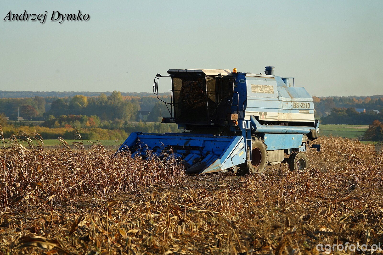 Kombajn Bizon BS Z110 podczas zbioru kukurydzy na malowniczym polu w jesiennym krajobrazie. Maszyna jest wyposażona w przystawkę do kukurydzy z dzióbami, co pozwala na efektywny zbiór kolb. Silnik o mocy około 200 KM zapewnia niezbędną energię do napędzania systemu omłotu, który sprawnie oddziela ziarna od reszty roślin. Pojemność zbiornika wynosząca 5200 litrów umożliwia długotrwałą pracę bez częstego rozładunku ziarna. Bizon BS Z110 charakteryzuje się solidną konstrukcją i jest dobrze przystosowany do różnych warunków polowych, co czyni go niezawodnym narzędziem w rolnictwie. Kolorystyka niebiesko-srebrna kombajnu współgra z otaczającym krajobrazem, podkreślając harmonijną współpracę technologii z naturą.