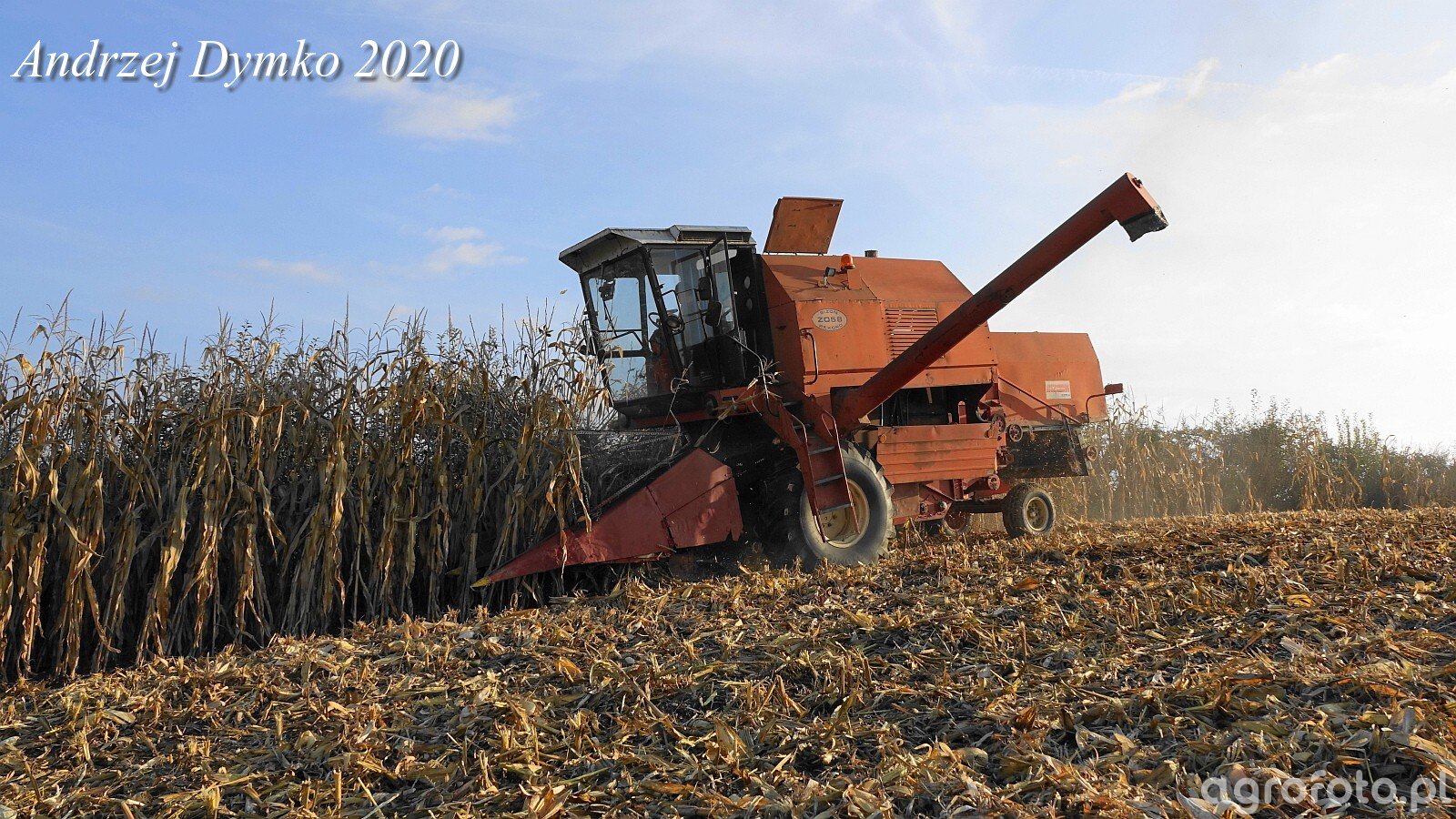 Kombajn Bizon Rekord Z058 podczas zbioru kukurydzy. Na zdjęciu widoczny jest charakterystyczny czerwony heder z dziobami, dostosowany do zbioru kolb kukurydzy. Maszyna pracuje na polu kukurydzy, co potwierdza obecność roślin w zaawansowanej fazie dojrzałości. Bizon Rekord Z058 jest napędzany sześciocylindrowym silnikiem SW 400 o mocy 150 KM, zapewniającym odpowiednią moc do obsługi systemu omłotu klasycznego z bębnem młócącym. Kombajn wyposażony jest w zbiornik ziarna o pojemności 4500 litrów, co umożliwia dłuższą pracę bez konieczności częstego rozładunku. Jego solidna konstrukcja i efektywność pracy czynią go odpowiednim wyborem dla średnich gospodarstw rolnych, zajmujących się uprawą kukurydzy.
